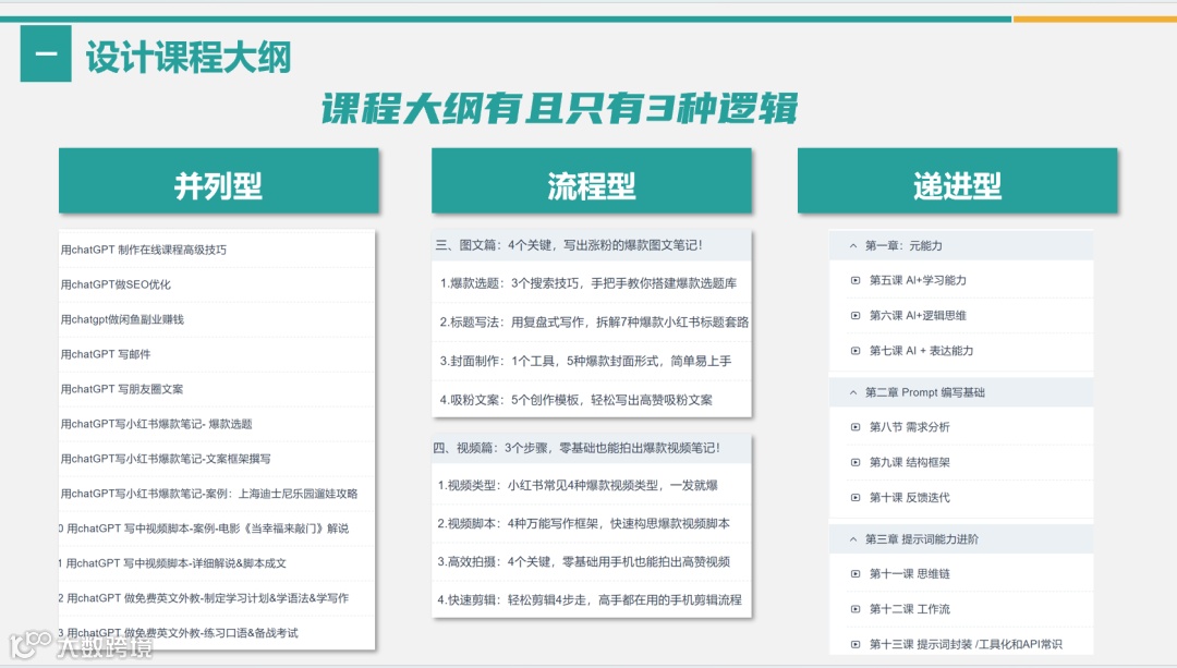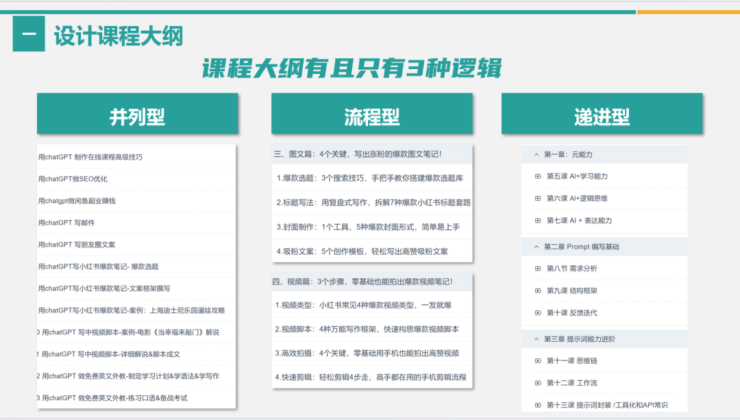 在使用并列型大纲的时候,需要看的是解决问题的方法是不是相同的,或者解决不同的问题是否需要有前置条件,比如你要用好chatGPT,首先你要知道怎么访问这个网站对吧,然后你还要知道什么叫提示词对吧,然后你得知道写提示词的基本逻辑对吧,这些都是前置条件,有一章专门讲这些前置性的知识,后面再列这些场景讲不同场景下具体怎么用,就是一门卖相很好的课了。