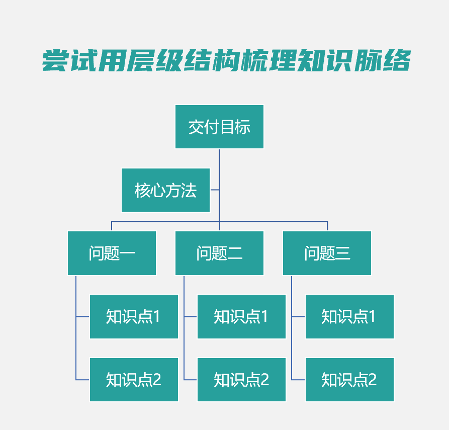 在列知识脉络的时候,给大家一个工具,尝试用层级结构梳理知识脉络,也可以用鱼骨图,最上面是交付目标,也就是你要帮谁解决什么问题,通过解决这些问题,实现什么结果;交付目标的下一层级,是核心方法,再接下来是列问题和解决问题的知识点。