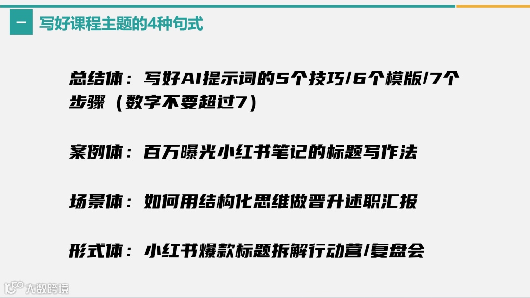 第一种,总结体,例如写好AI提示词的5个技巧或者6个模版或者7个步骤,简单直接的说明你要交付的内容是什么;