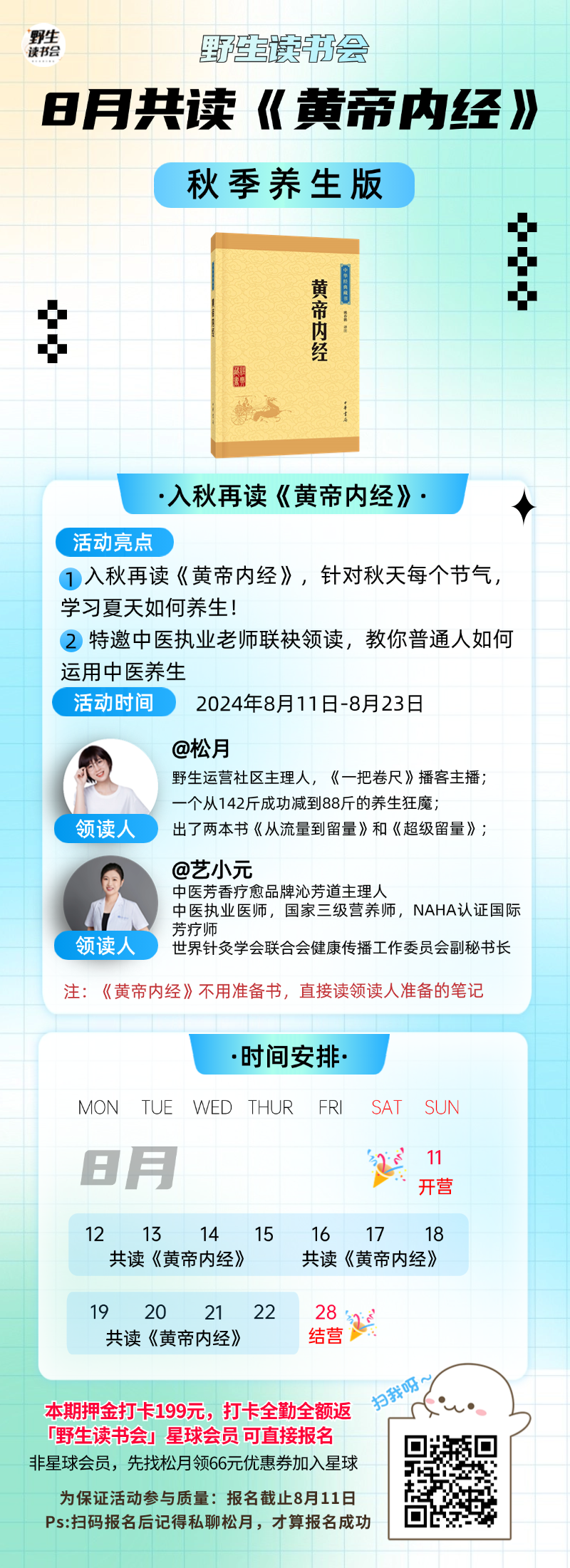 8月7日进入立秋节气,野生读书会在8月11日~8月23日开启半个月的《黄帝内经(秋季版)》的共读,为了保证参与质量,本次限量报名,话不多说,先来报名!更多活动介绍可戳👇: