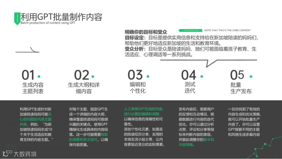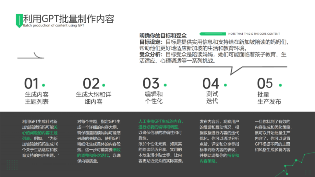 GPT是一个强大的内容生产工具,可以帮助我们批量制作高质量的内容。首先,我们需要明确目标和受众。例如,我们的目标是提供实用信息和支持给在新加坡陪读的妈妈们,帮助他们更好地适应新加坡的生活和教育环境。