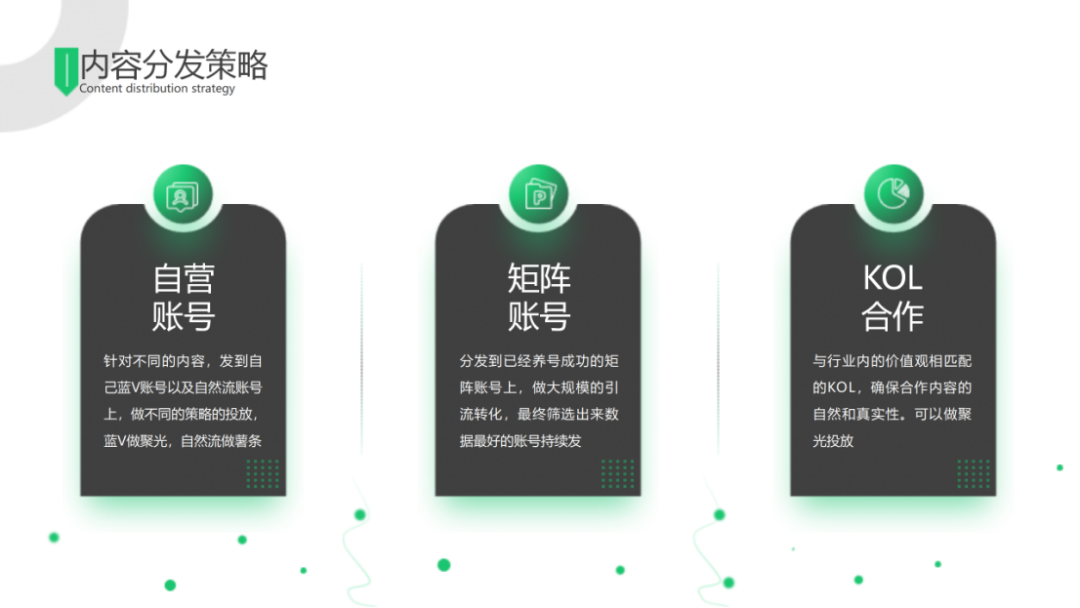 内容分发是获客的关键环节。我们可以通过自营账号、矩阵账号和KOL合作三种方式来进行内容的分发。