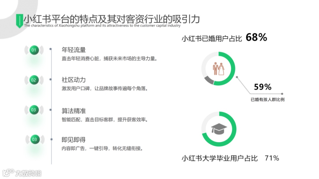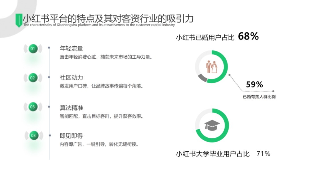 小红书的特点在于其用户群体的独特性。已婚用户占比高达68%,这部分人群掌握着家庭的经济大权,购买决策权都是在他们的手里面。这意味着小红书聚集了大量的年轻家庭。这些用户不仅年轻,而且具有较高的消费能力和消费意愿。