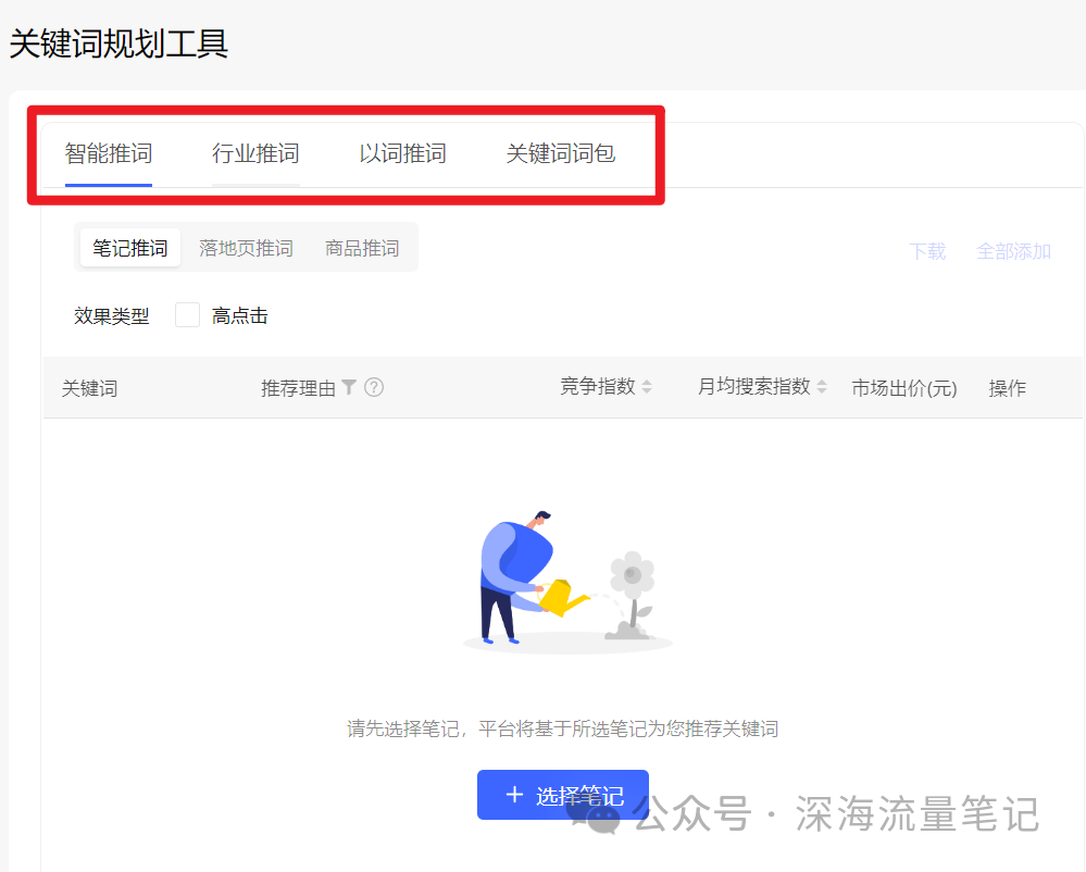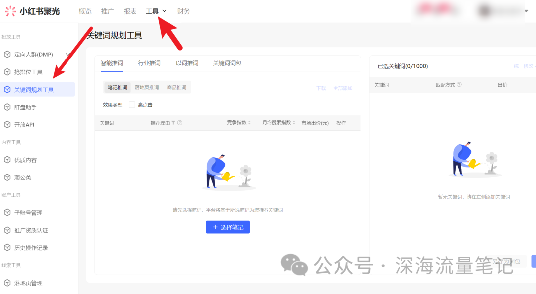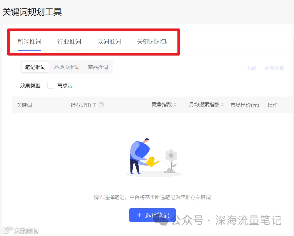 智能推词可以通过你过往的笔记,落地页,商家的商品进行推荐关键词,这个部分的关键词推送数量少,相对精简。