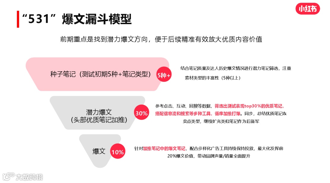 高质量的投放笔记其实是不断测试出来的,我们会花大量的时间去找爆款的对标笔记,本质上也是希望从对标中找到流量密码,但是这个过程很多小伙伴其实是没有头绪到底该怎么做的,上图是小红书给到的爆款531模型,在我看来这个爆款模型过于保守,实际上应该是1031模型,那就是至少测试10种不同类型的爆款对标,从这个过程中筛选出数据好的笔记,2~3篇,如果没有,那证明还需要再多测试几次。