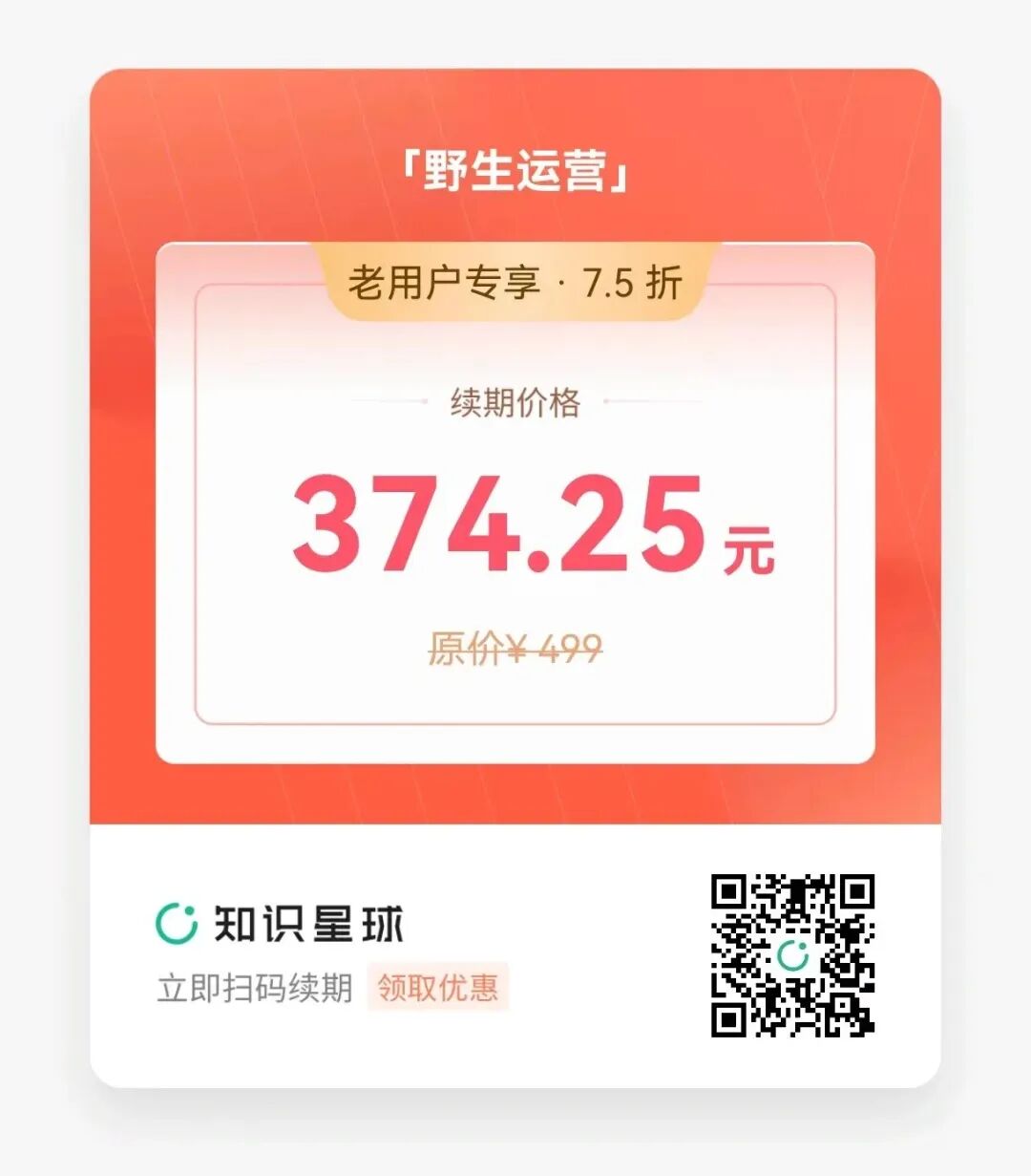 欢迎加入野生运营星球,每月两快闪分享、运营人学习一手资料、1V1答疑……等硬核干货,而且还能一次入手包括上万个案例拆解全库、190+场群分享的音频+逐字稿、N多运营工具包和资料,就问你一句,值不值?