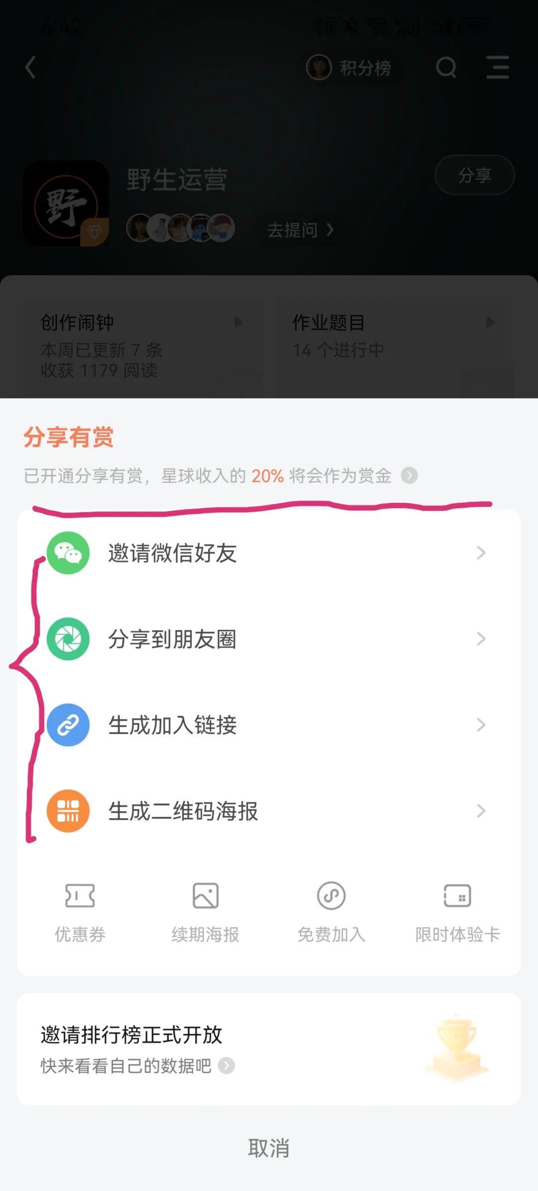1)进入知识星球APP,并进入野生运营专区,点击右上角“分享”