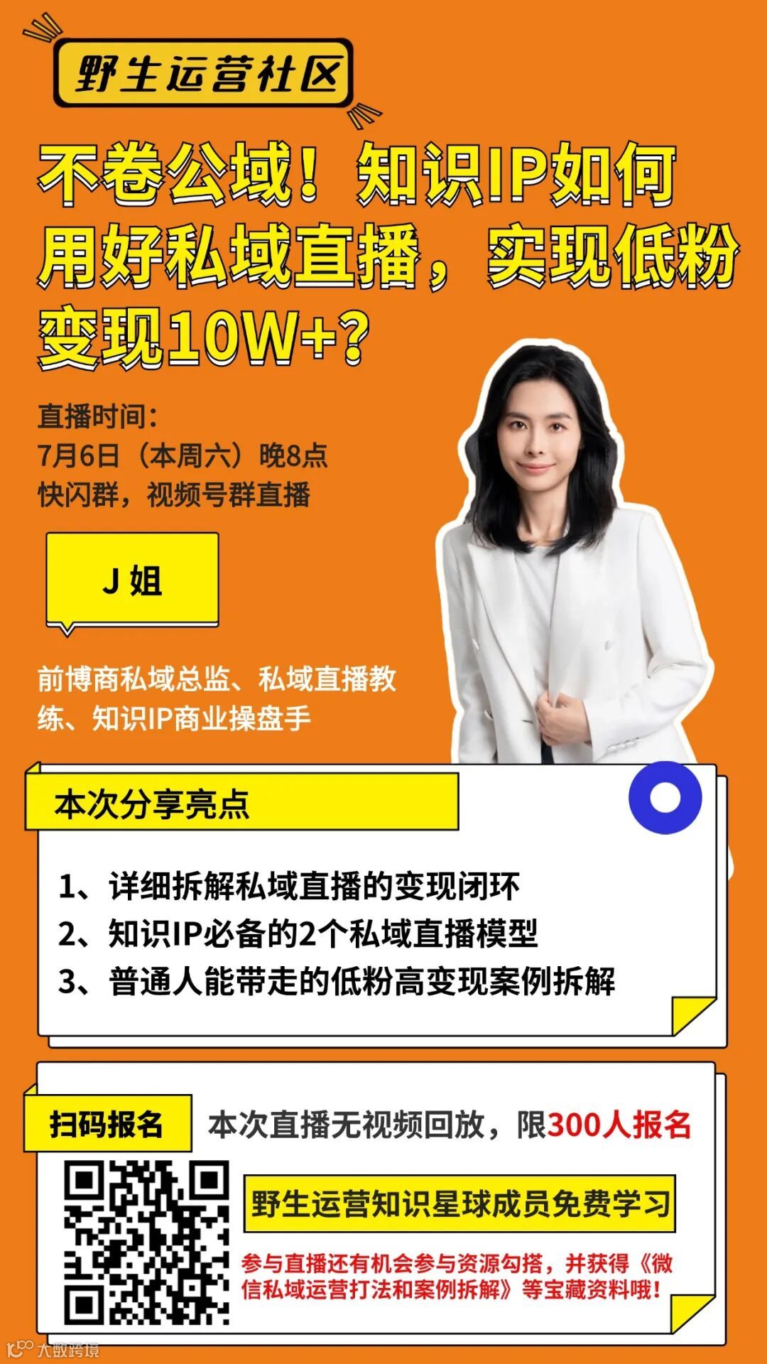 这周六晚8点,我邀请来野生运营的老朋友 J 姐,前博商私域总监、私域直播教练、知识IP商业操盘手带来分享,《不卷公域!知识IP如何用好私域直播,实现低粉变现10W+》。