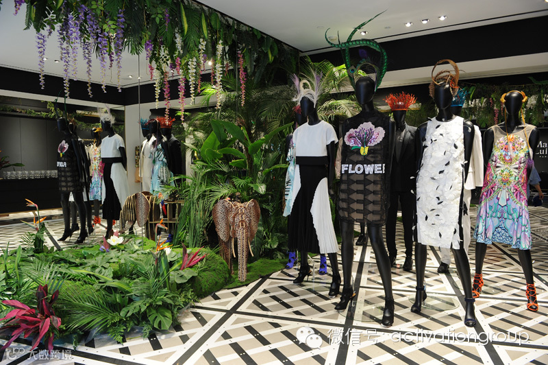 当日开幕现场的Fashion Jungle主题派对也被亚马逊热带雨林的风情环绕:高大的棕榈树,形态各异的木质非洲野生动物模型让人仿佛置身于万里之外的丛林中。