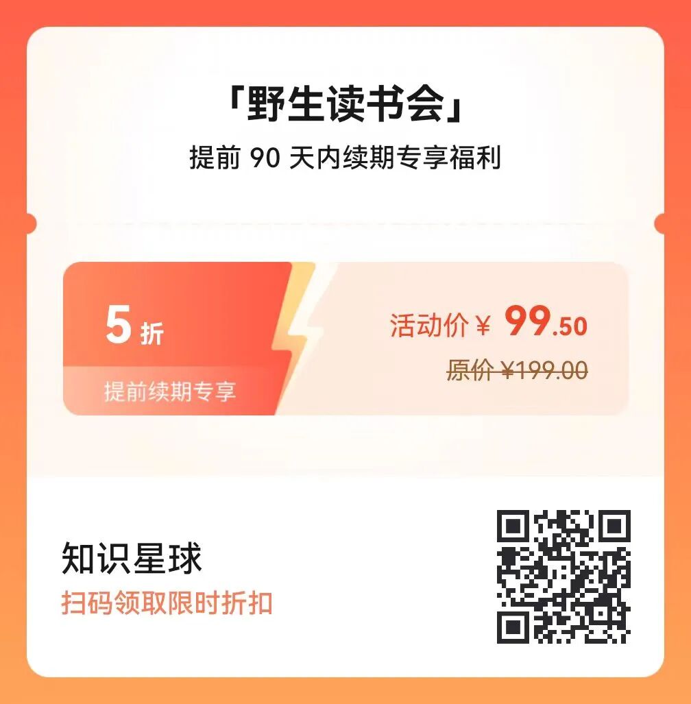 末尾再啰嗦一句,今天是 423 读书日,“野生读书会-知识星球会员”优惠活动来啦,新朋友立减 88 元加入,老朋友续费立减 100 元,活动仅限 7 天(4月23日~4月30日),活动结束“野生读书会-知识星球会员”将会涨价至 299 元。