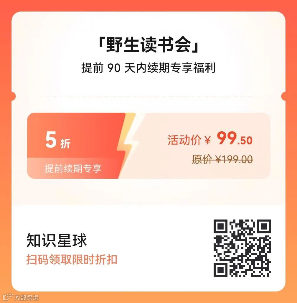 正值 423 读书日,“野生读书会-知识星球会员”优惠活动来啦,新朋友立减 88 元加入,老朋友续费立减 100 元,活动仅限 7 天(4月23日~4月30日),活动结束“野生读书会-知识星球会员”将会涨价至 299 元。