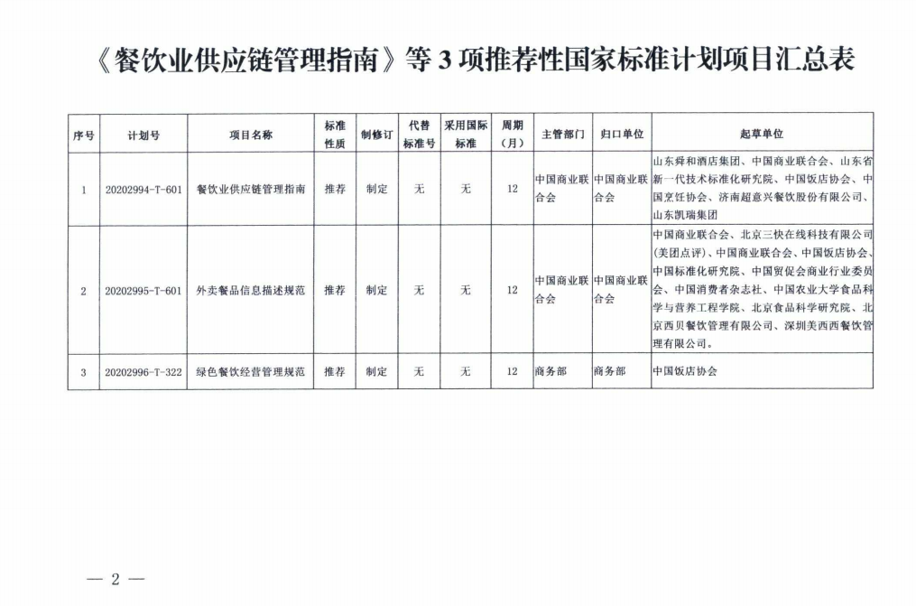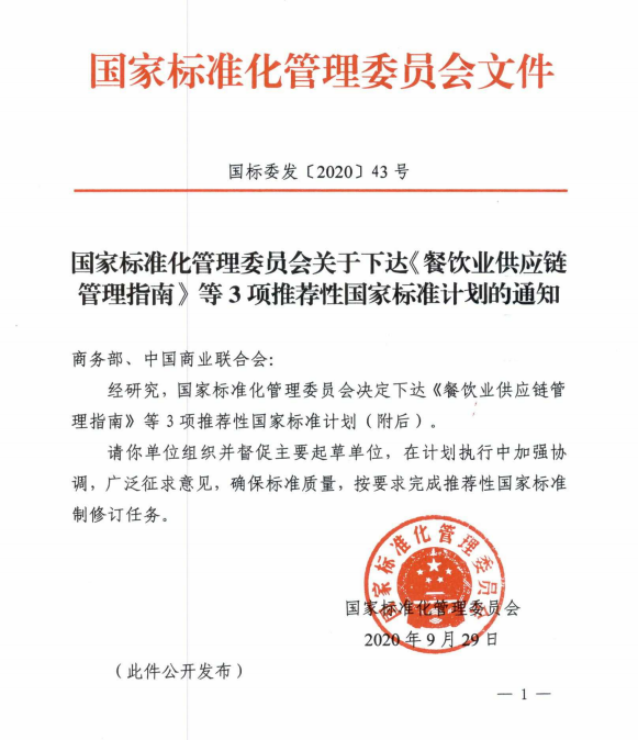 国家标准化管理委员会关于下达《餐饮业供应链管理指南》等3项推荐性国家标准计划的通知