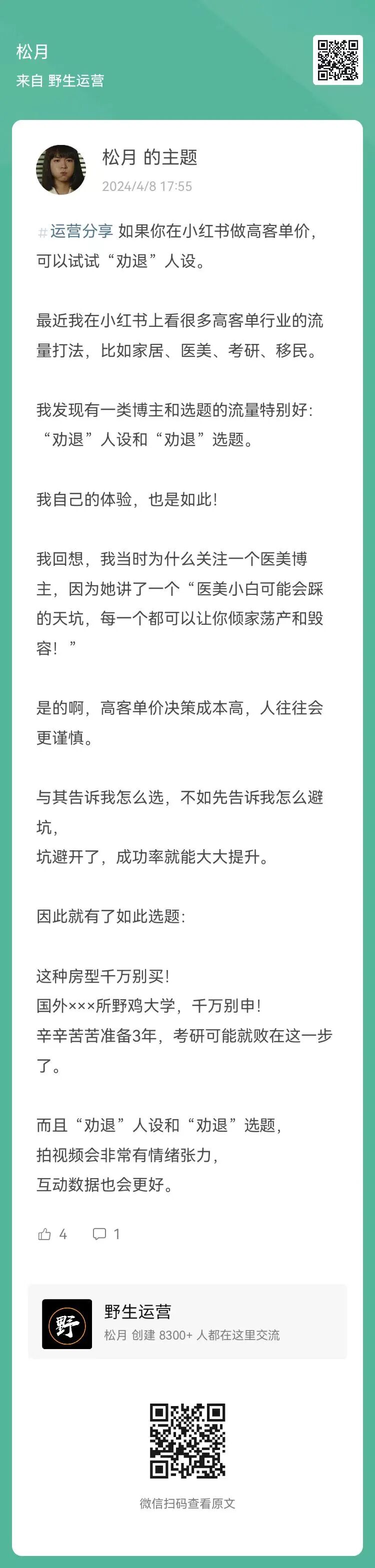 3、如果你在小红书做高客单价,可以试试“劝退”人设(扫码查看全文)