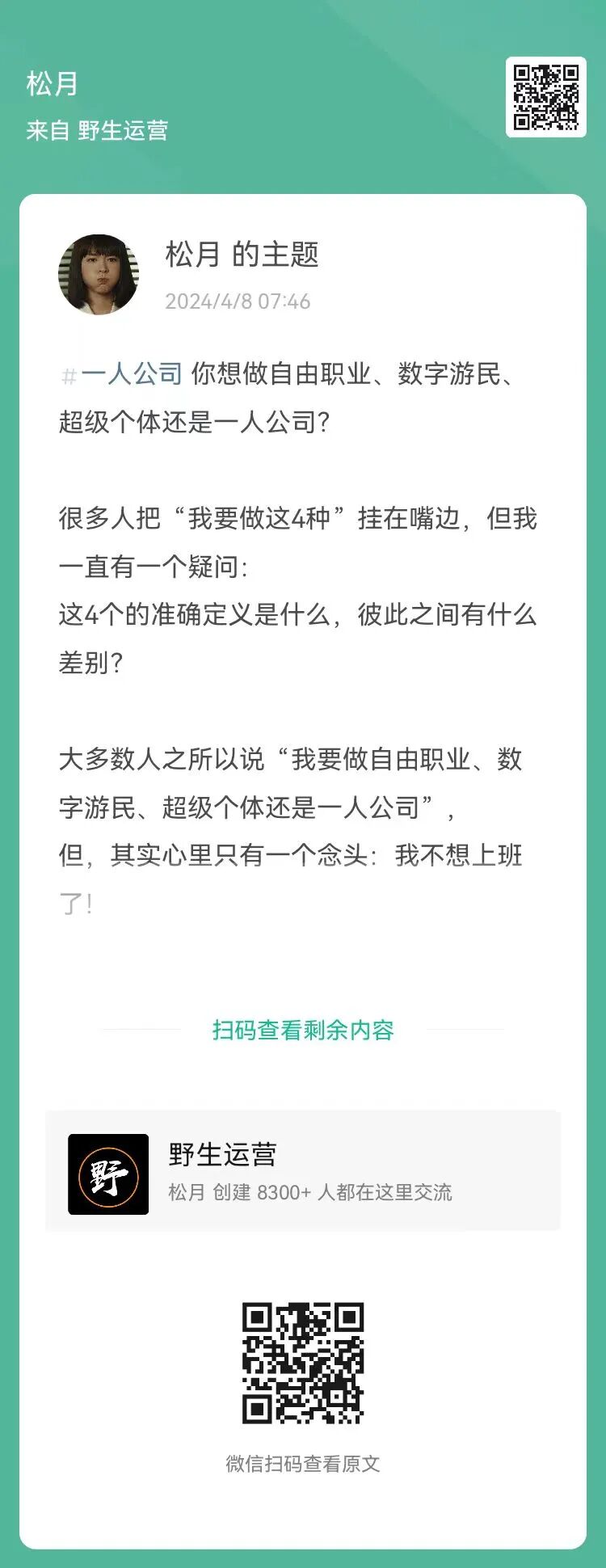 1、松月:自由职业、数字游民、超级个体和一人公司的准确定义是?(扫码查看全文)