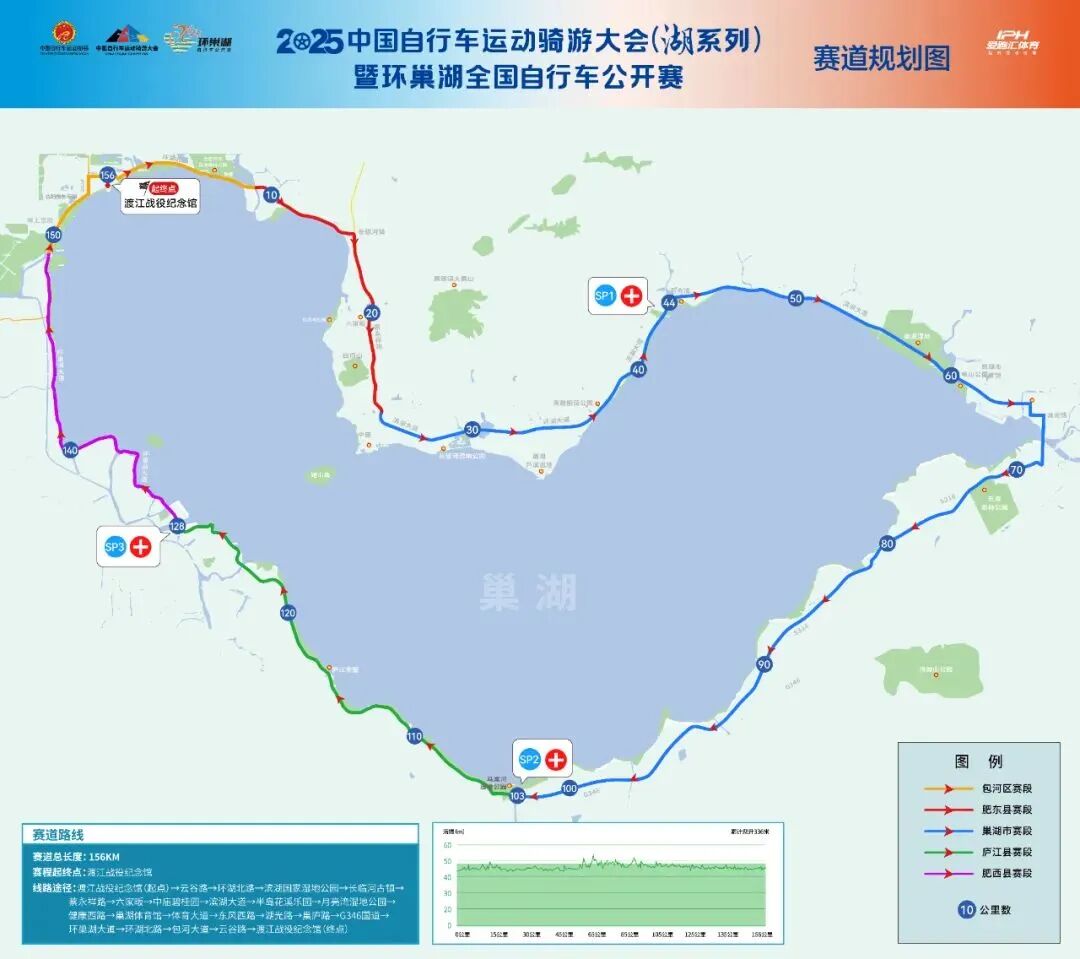 美利达-诺飞客车队张维毅、徐兆亮、徐暄评、熊凯文、庞培林、王琨参加了此次男子精英组的比赛,2025环巢湖赛道全程约156公里,首次实现完整环巢湖一圈,比赛路线: