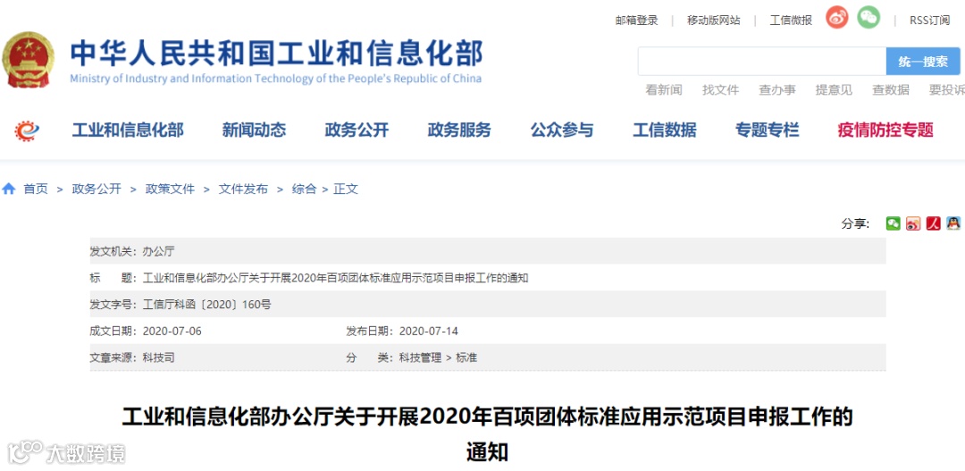 为深入贯彻《中华人民共和国标准化法》《国务院关于印发深化标准化工作改革方案的通知》(国发〔2015〕13号),按照《工业和信息化部关于培育发展工业通信业团体标准的实施意见》(工信部科〔2017〕324号)要求,我部将组织开展2020年度工业通信业百项团体标准应用示范项目申报工作。现就有关事项通知如下: