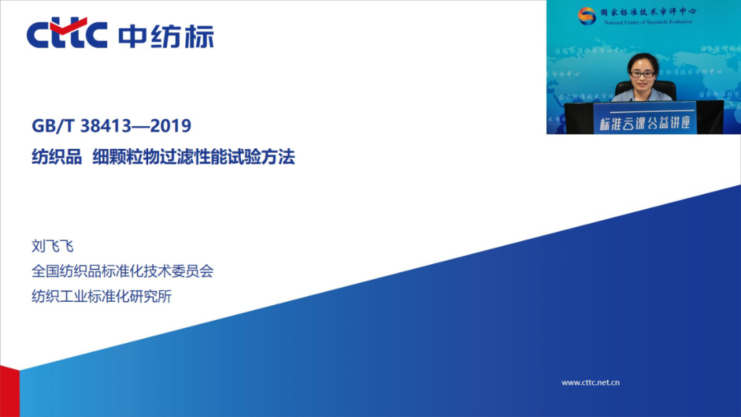 东华大学纺织学院非织造材料与工程系教授靳向煜介绍了熔喷法非织造布技术及相关标准情况,全国纺织品标准化技术委员会产业用纺织品分技术委员会(SAC/TC209/SC7)副秘书长刘飞飞围绕GB/T 38413-2019《纺织品 细颗粒物过滤性能试验方法》标准解读,网络直播后,还在线进行了答疑。利用网络开展宣贯和介绍,匹配企业实际生产需求,提供标准化技术支持,促进规范行业竞争秩序,助力企业复工复产和科学防控疫情。