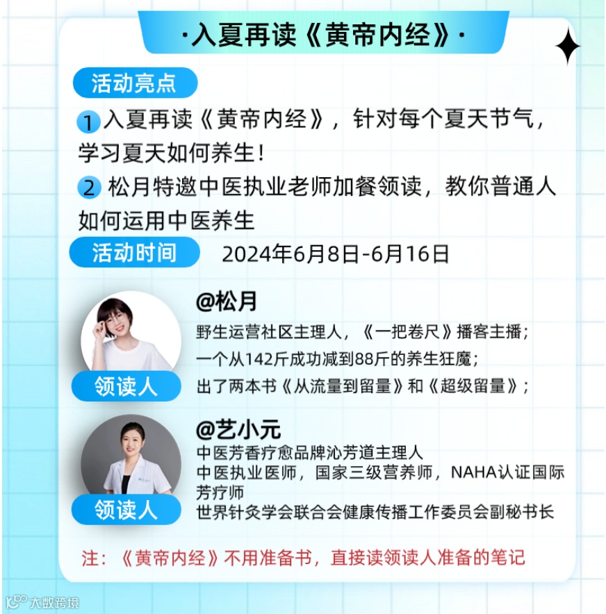 ?主打一个身心同时保健!剧透一下,6月会有《黄帝内经》夏季养生共读,松月亲自领读,机会难得,不要错过啦!
