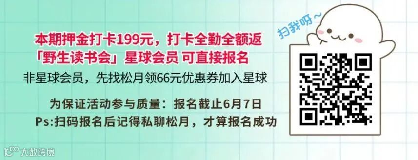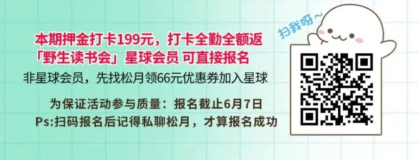 ①「野生读书会」知识星球会员,直接扫码报名,然后私聊松月,报名截止今天中午12点;