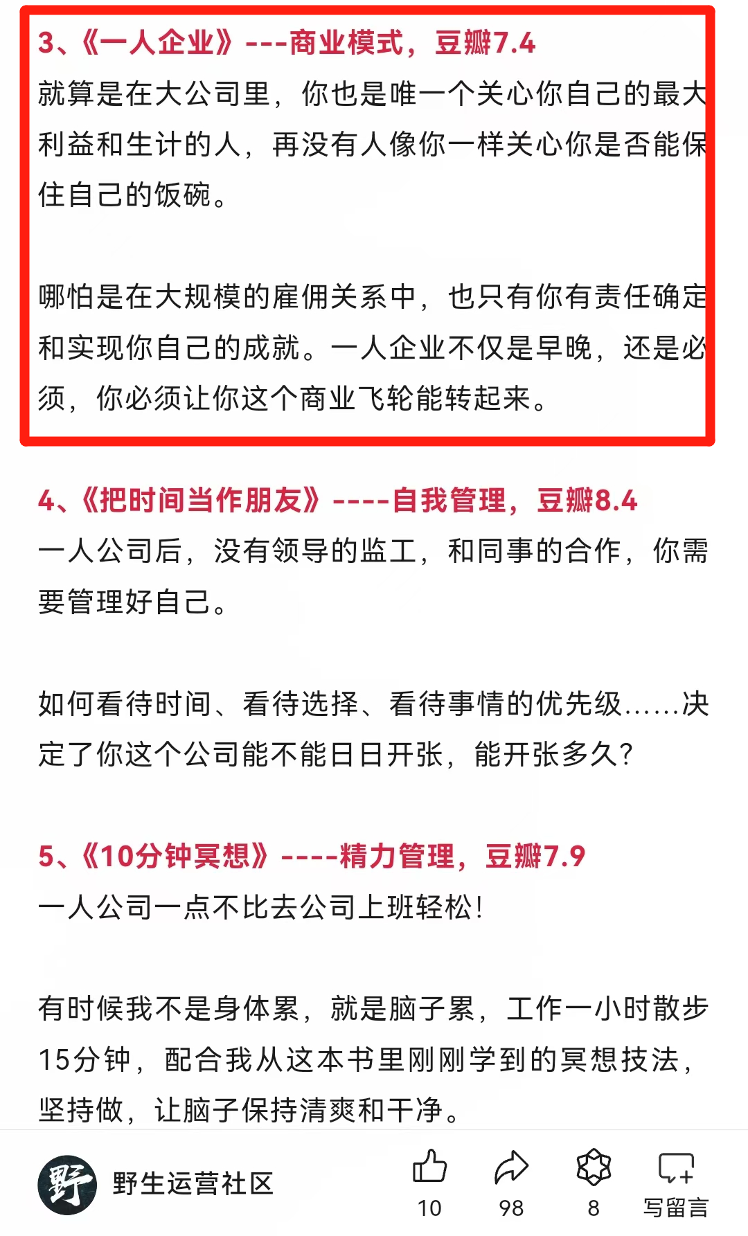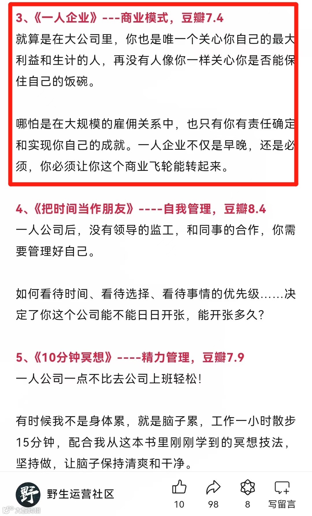 哪怕你现在还没有开启一人企业的想法,这本书依然能帮我们应对职业规划的迷茫,解答一些事业发展的问题。