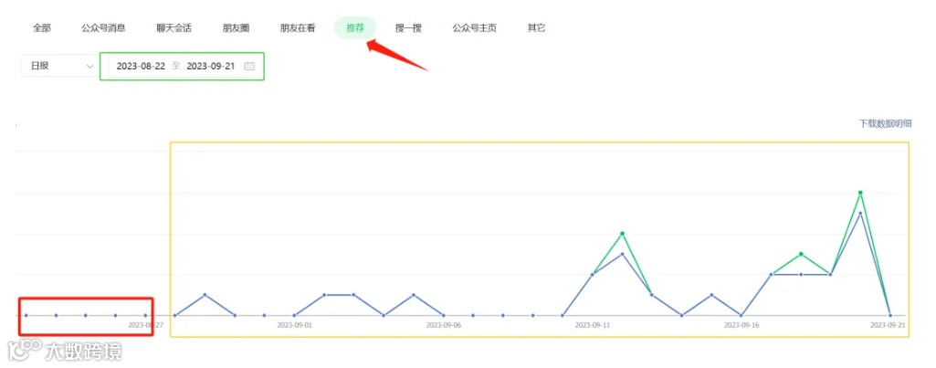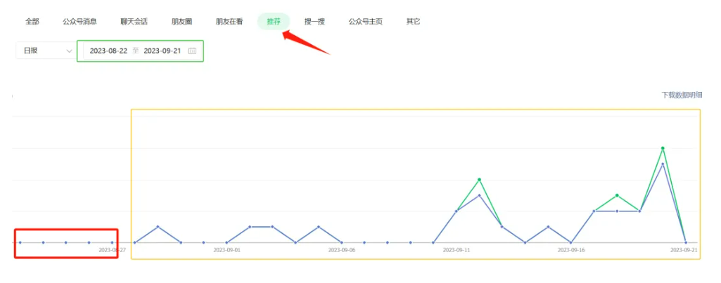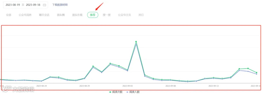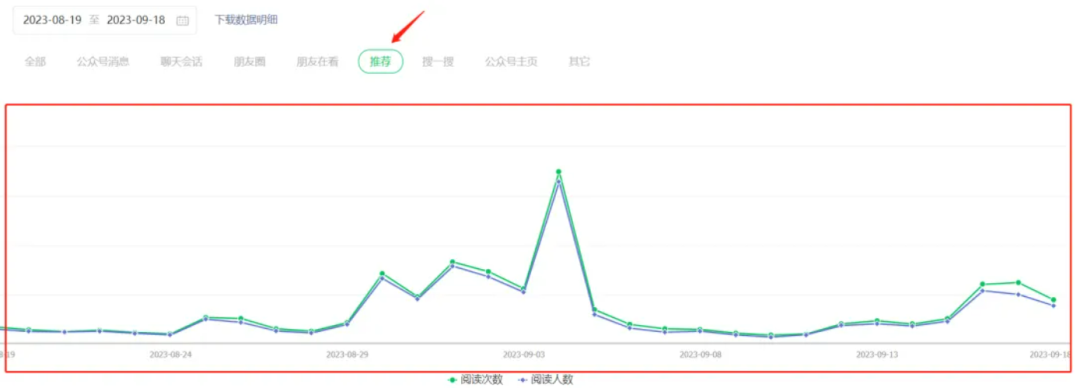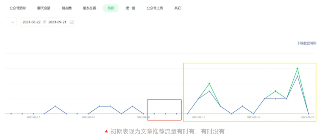 刚开始更新几篇内容后,这个新号文章推荐流量已经断续的出来了;可以看到从8月28日起更新,文章推荐流量从9月初就已经介入。