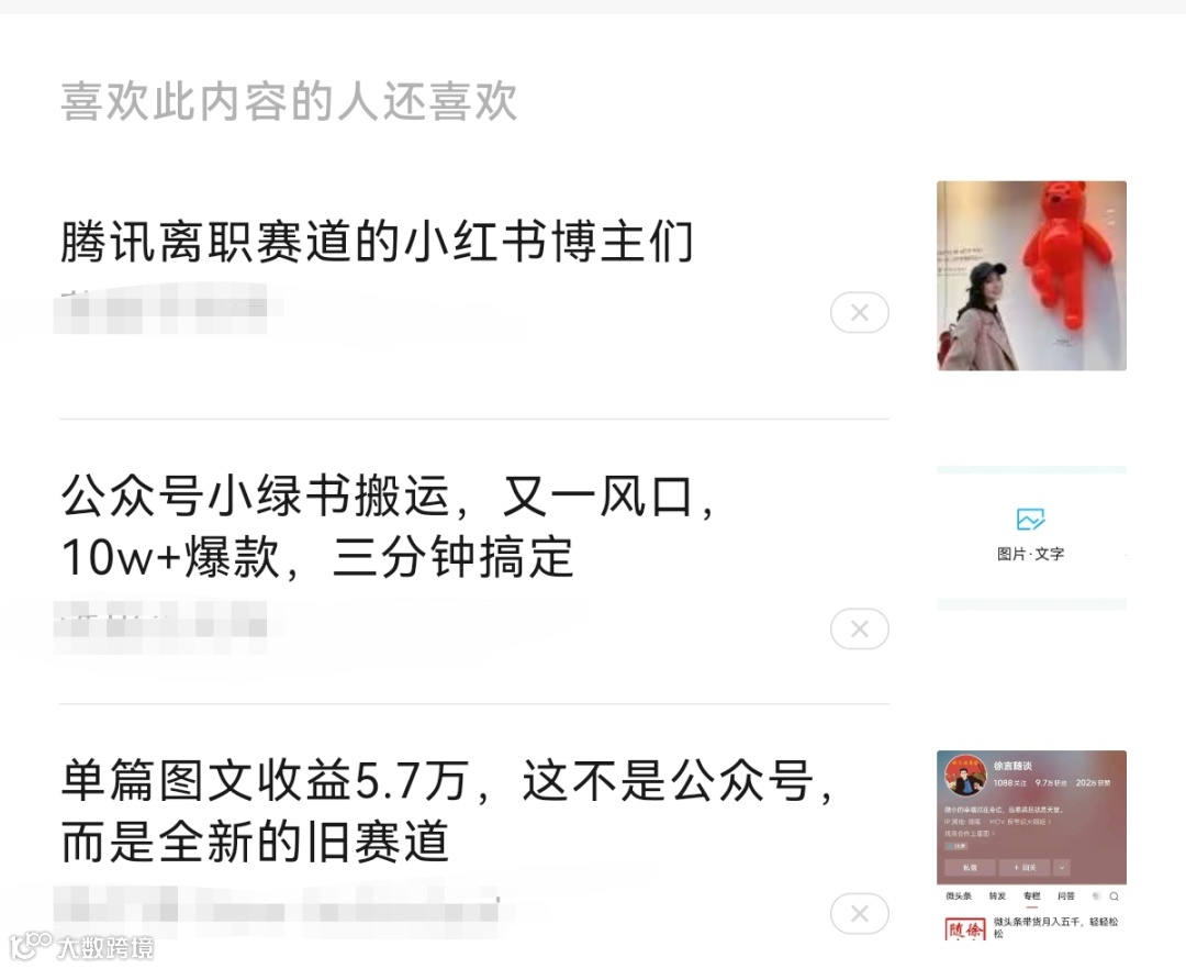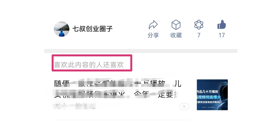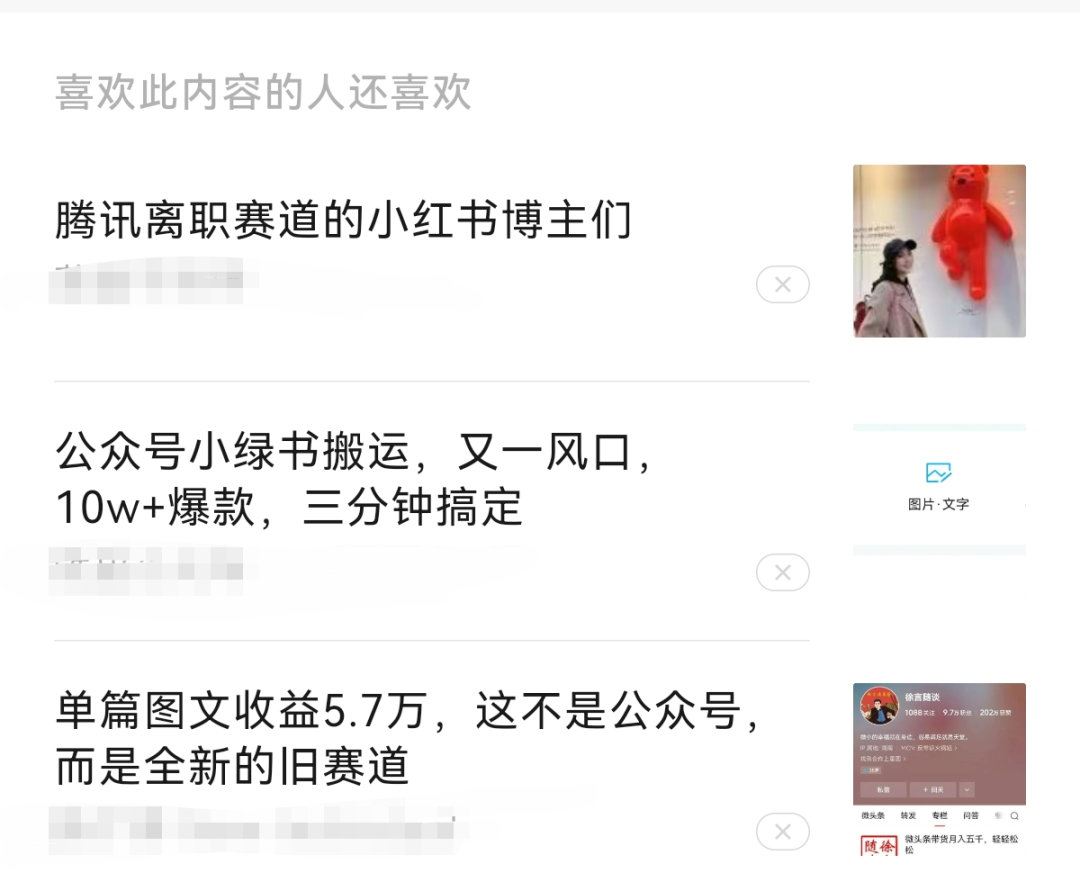 新号前期当流量导入一段时间后,数据和账号文章积累到一定的情况下,再作出点赞行为你就会发现下面会出现同领域的文章推荐,这时候就表明你账号文章的阅读人群已经逐渐精准垂直化。
