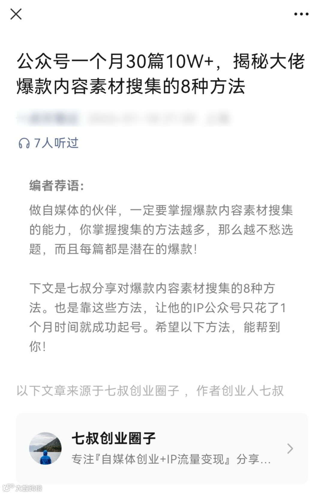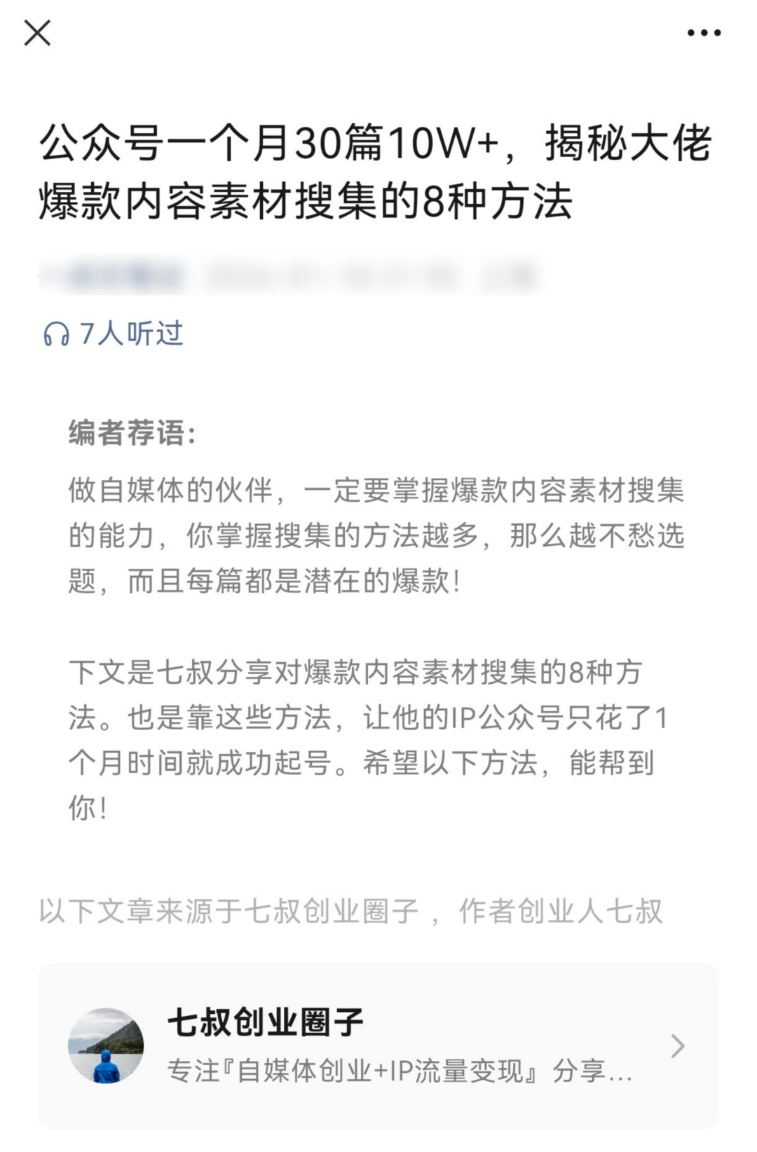 老七,七叔创业圈子的主理人,公众号起号半个月涨粉2K+,单篇付费阅读文章近300人