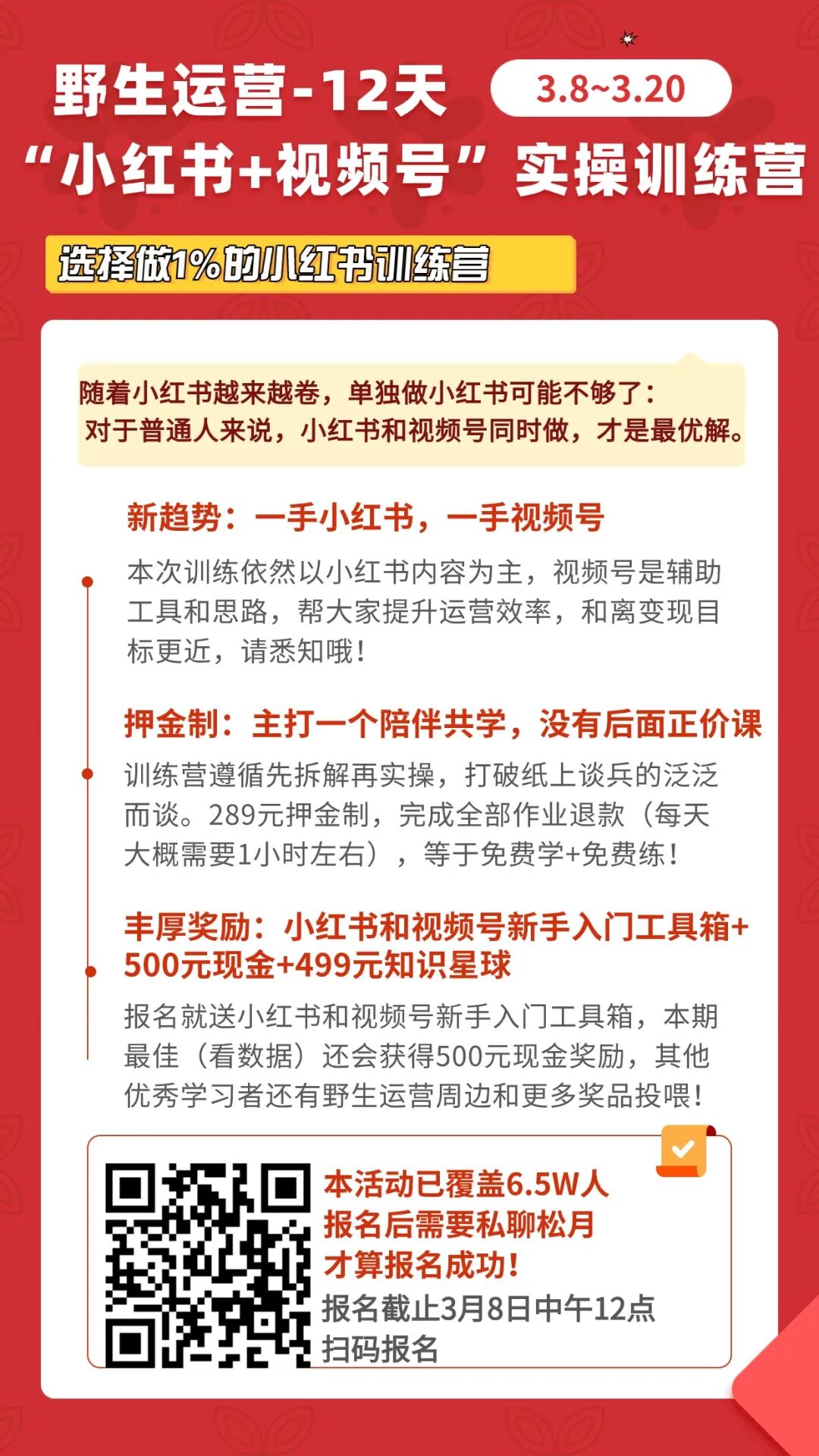 一个人比较难坚持,但一群人就可以,欢迎加入本期训练营,咱们一起在小红书上做出可能性!本次训练营为了保证学习质量,依然是限量报名,感兴趣的小伙伴扫码报名吧!