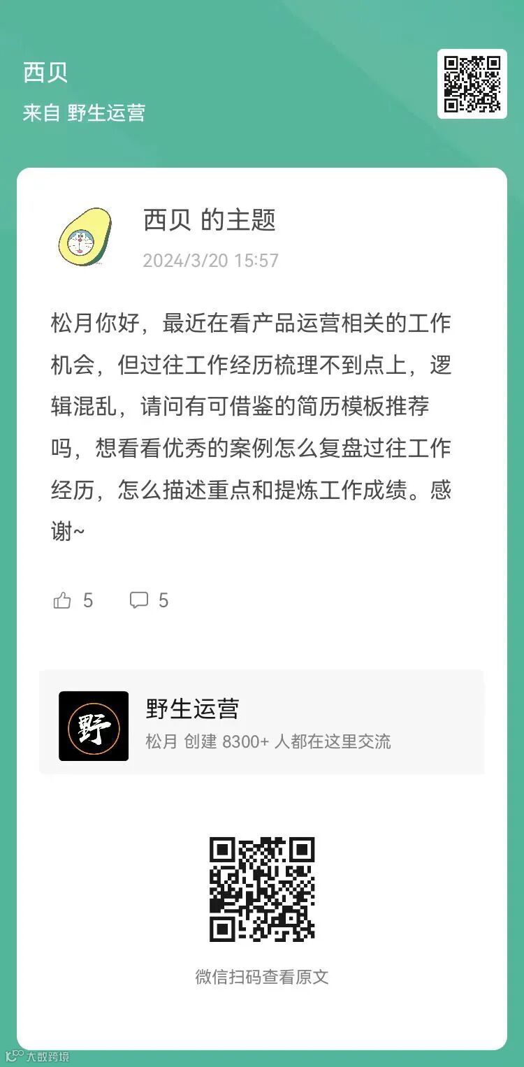 5、提问:请问有可借鉴的简历模板推荐吗,想看看优秀的案例怎么复盘过往工作经历,怎么描述重点和提炼工作成绩?(扫码查看全文)