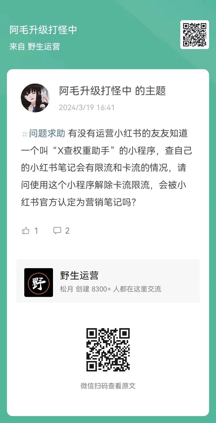 2、提问:有没有运营小红书的友友知道一个叫“X查权重助手”的小程序,能用吗?(扫码查看全文)