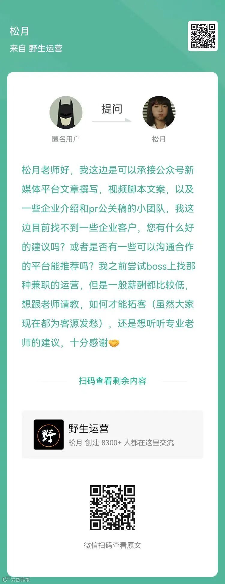 8、提问:我这边目前找不到一些企业客户,您有什么好的建议吗?(扫码查看全文)