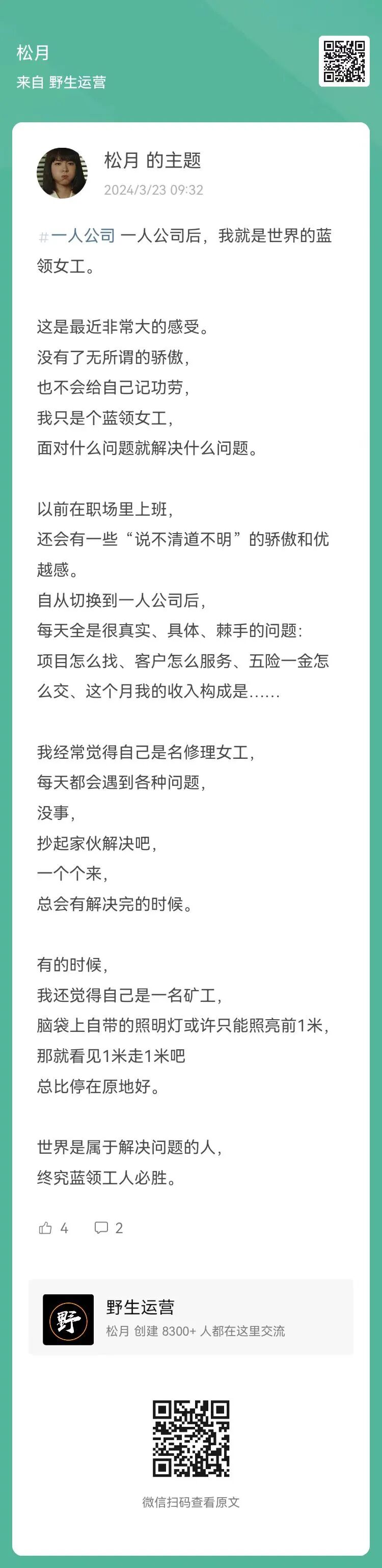 11、松月:一人公司后,逐渐体会到,会做运营的,真的有点吃香
