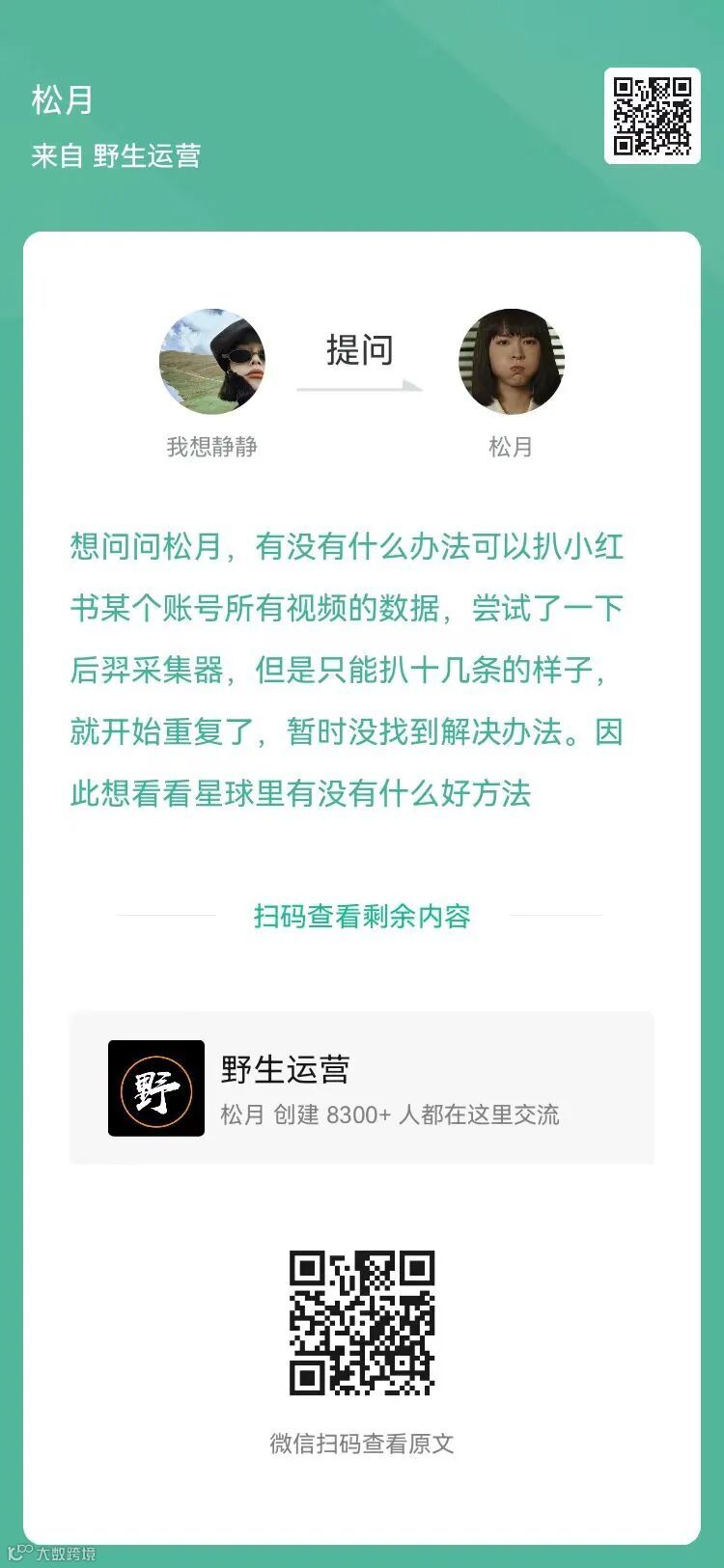 3、提问:有没有什么办法可以扒小红书某个账号所有视频的数据?(扫码查看全文)