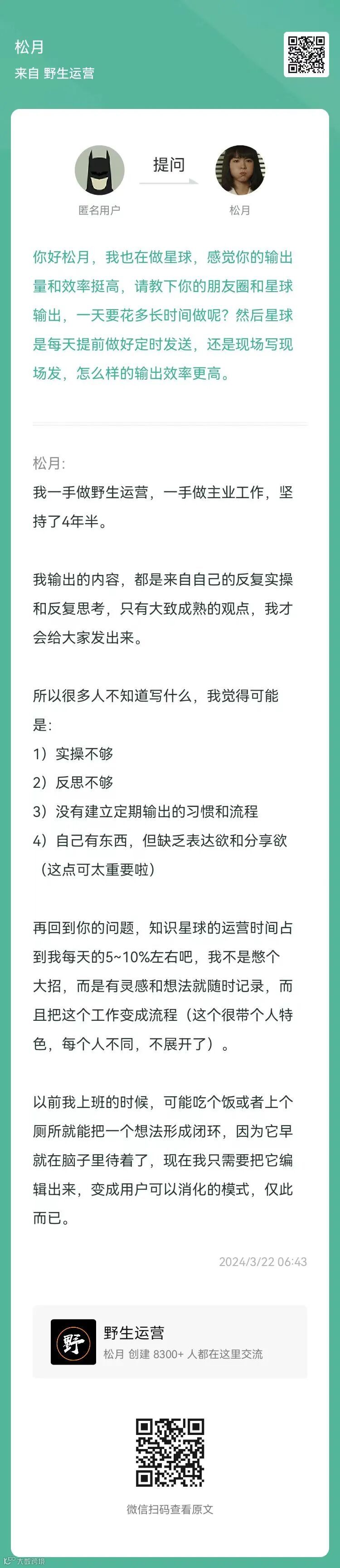 7、提问:感觉你的输出量和效率挺高,请教下你的朋友圈和星球输出,一天要花多长时间做呢?然后星球是每天提前做好定时发送,还是现场写现场发,怎么样的输出效率更高?(扫码查看全文)