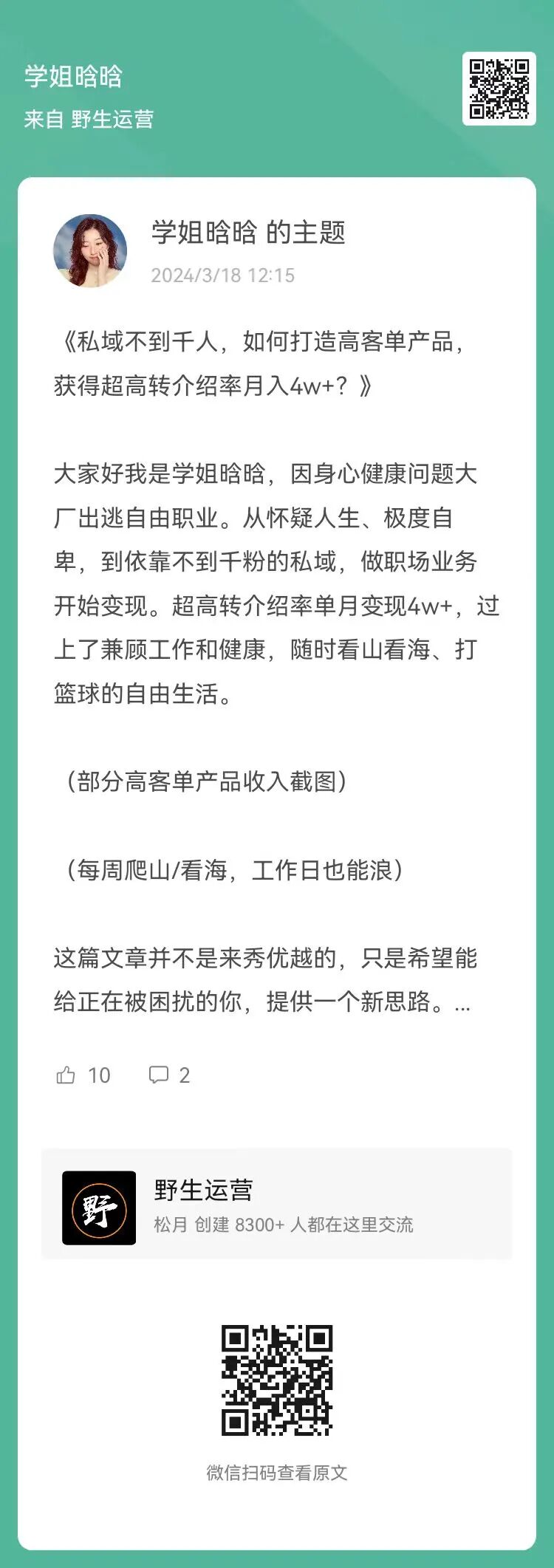 2、学姐晗晗:私域不到千人,如何打造高客单产品,获得超高转介绍率月入4w+