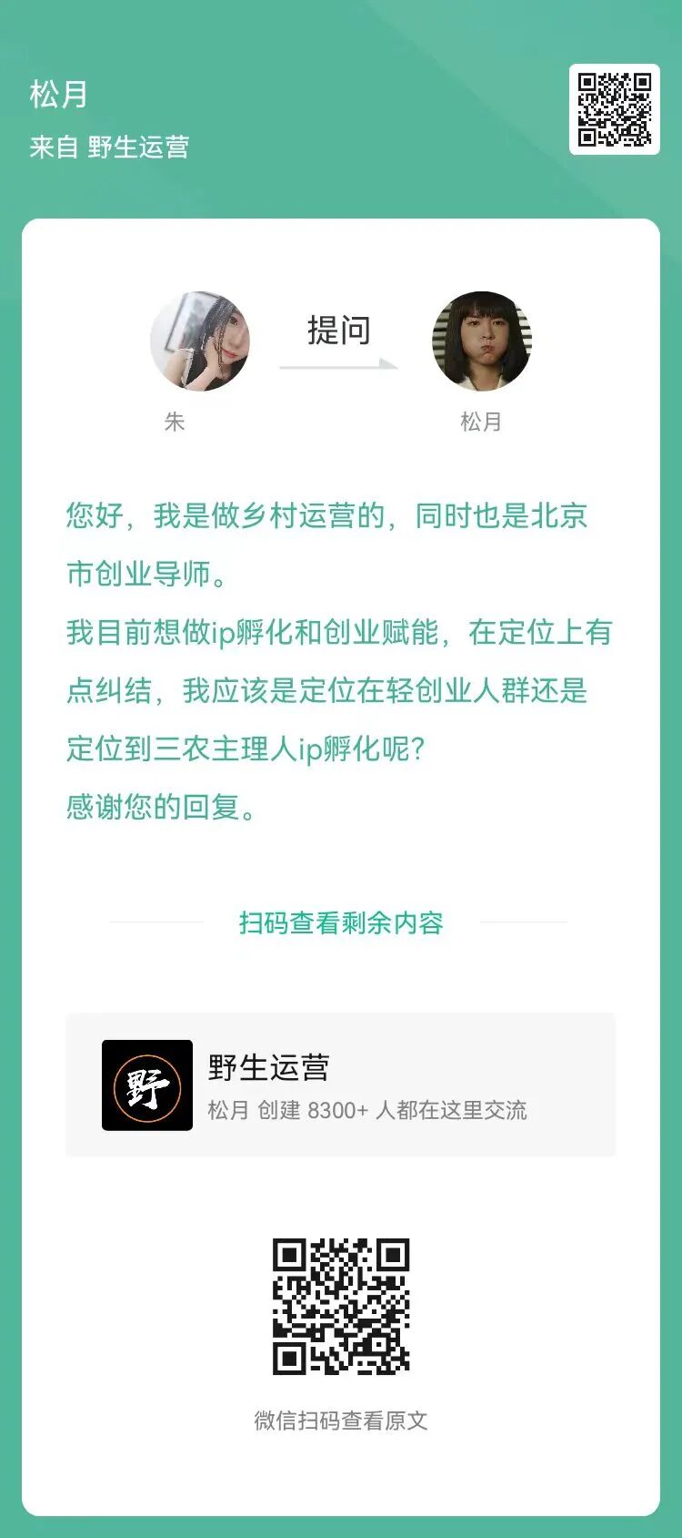 1、提问:我目前想做ip孵化和创业赋能,在定位上有点纠结,我应该是定位在轻创业人群还是定位到三农主理人ip孵化呢?(扫码查看全文)