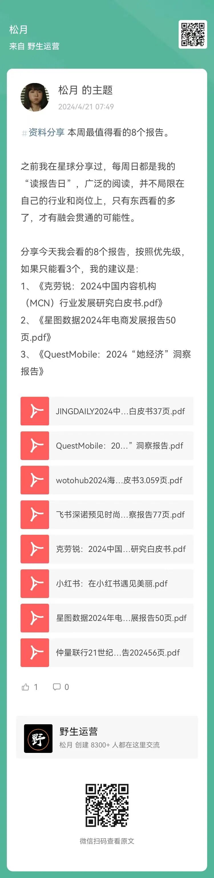 野生运营知识星球,每周会产生大量精华内容,每周一为你整理《野生运营:一周星球内参》,让你不错过任何一条有价值的信息。话不多说,这就开始!