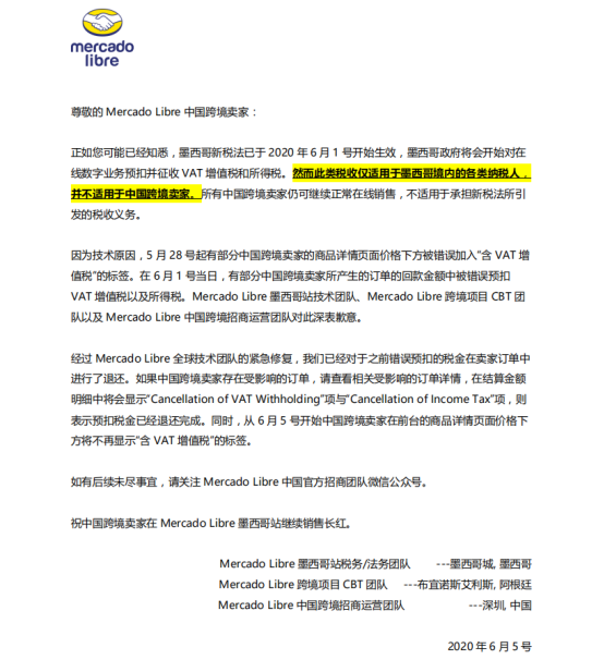6月5日,拉美电商巨头Mercado Libre发布公告称,墨西哥新税法仅适用于墨西哥境内的各类纳税人,中国跨境卖家仍可继续正常在线销售,不适用于承担新税法所引发的税收义务。