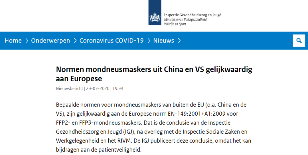 4月7日,荷兰医疗保健及青少年监察局官方网站公布,为保障疫情期间个人防护用品和医疗器械产品的充足供应,经荷兰社会事务及就业部(SZW)与荷兰国家公共卫生与环境研究院(RIVM)评估,中国部分口罩标准与相关欧洲标准等效。