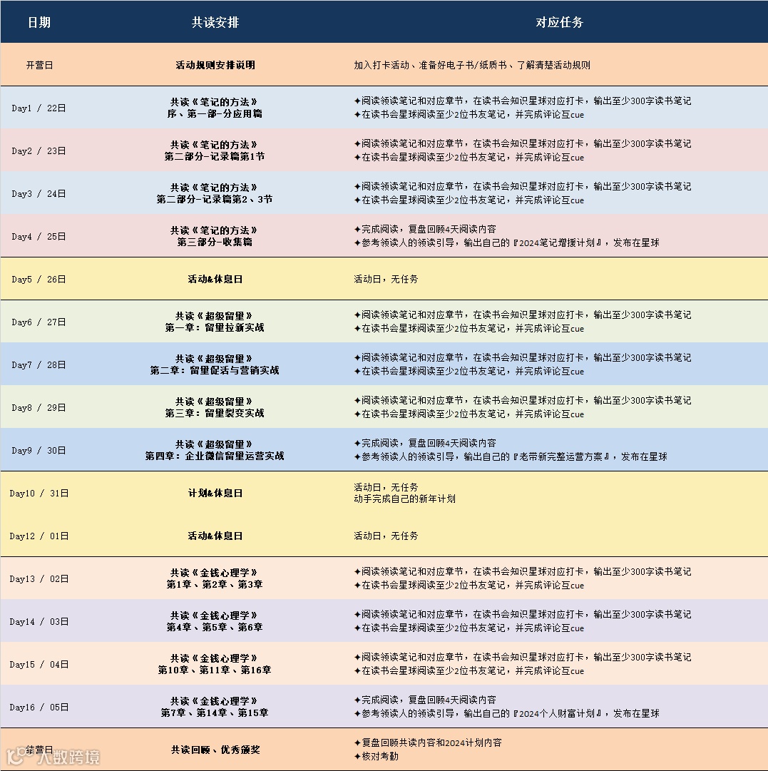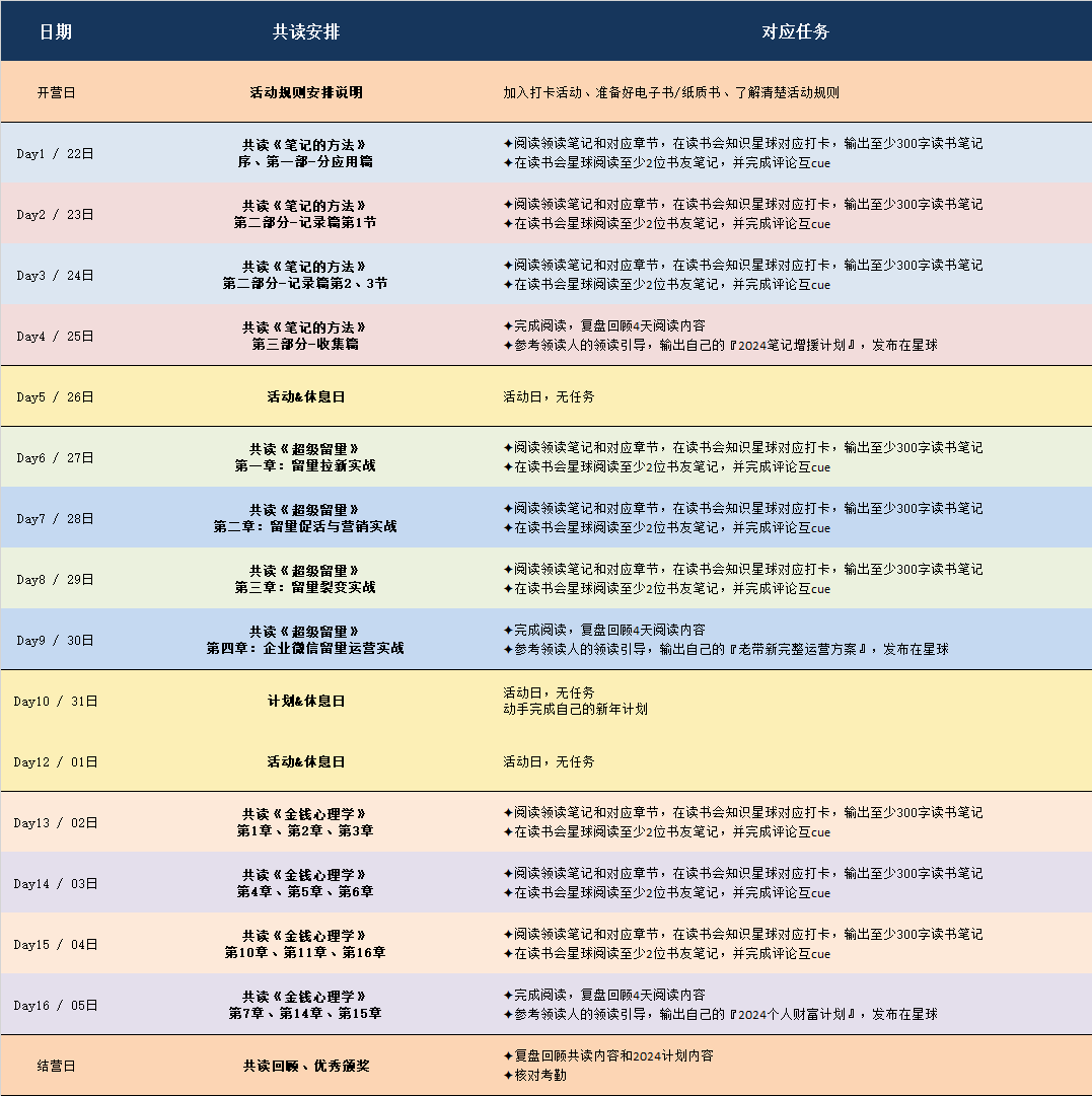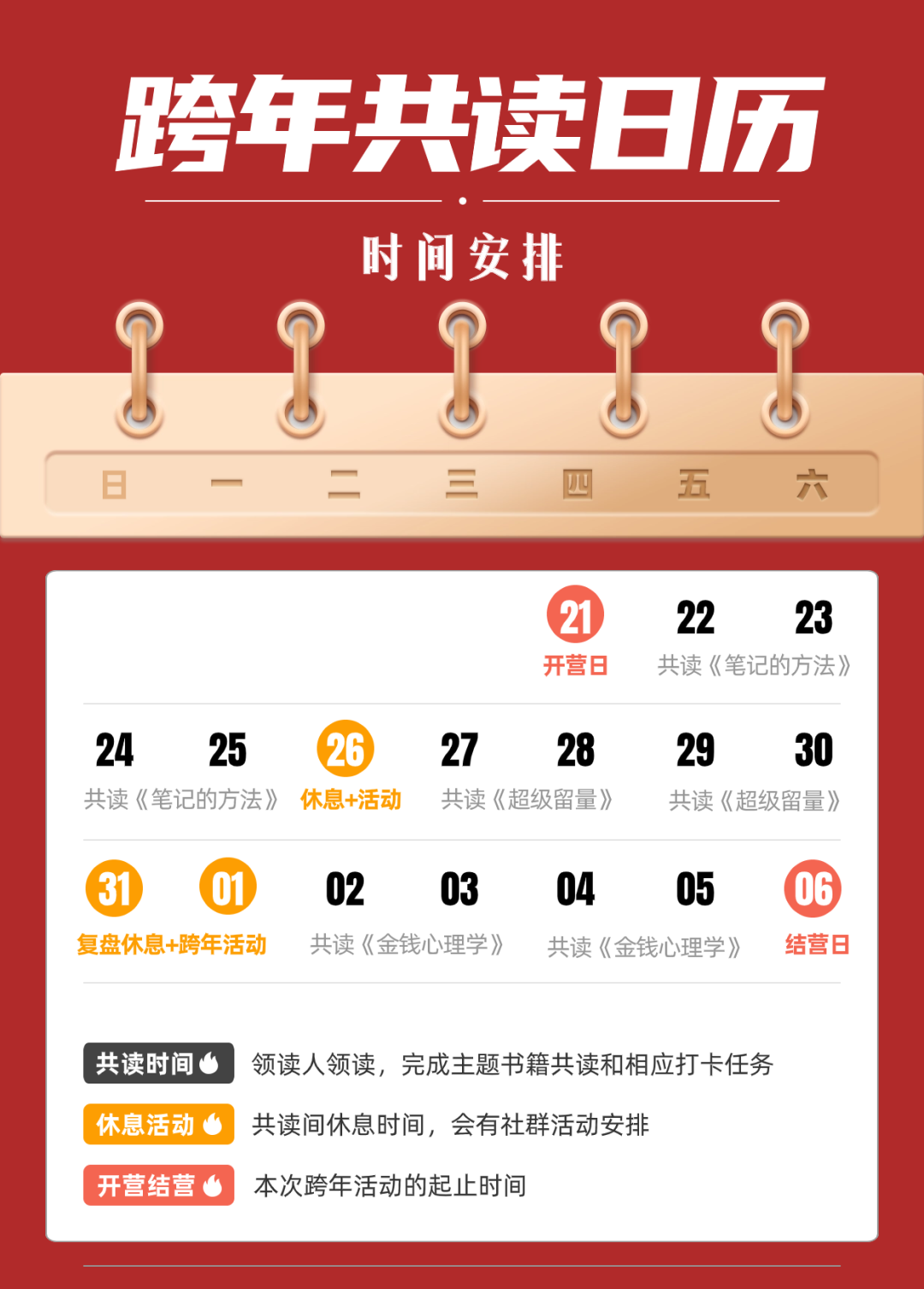 附,本次跨年共读日历表和日程表,方便你更好的了解本次活动进程。