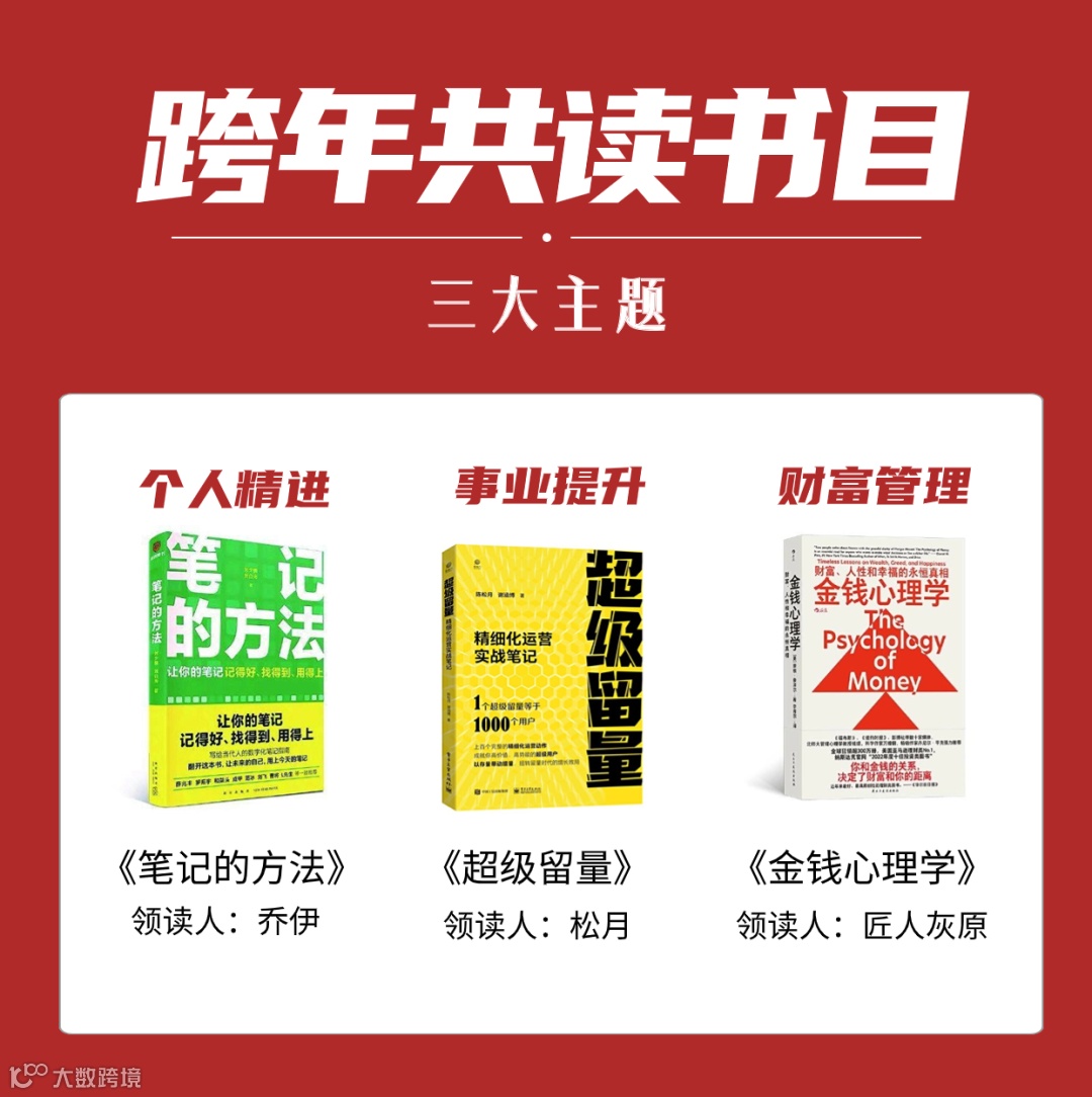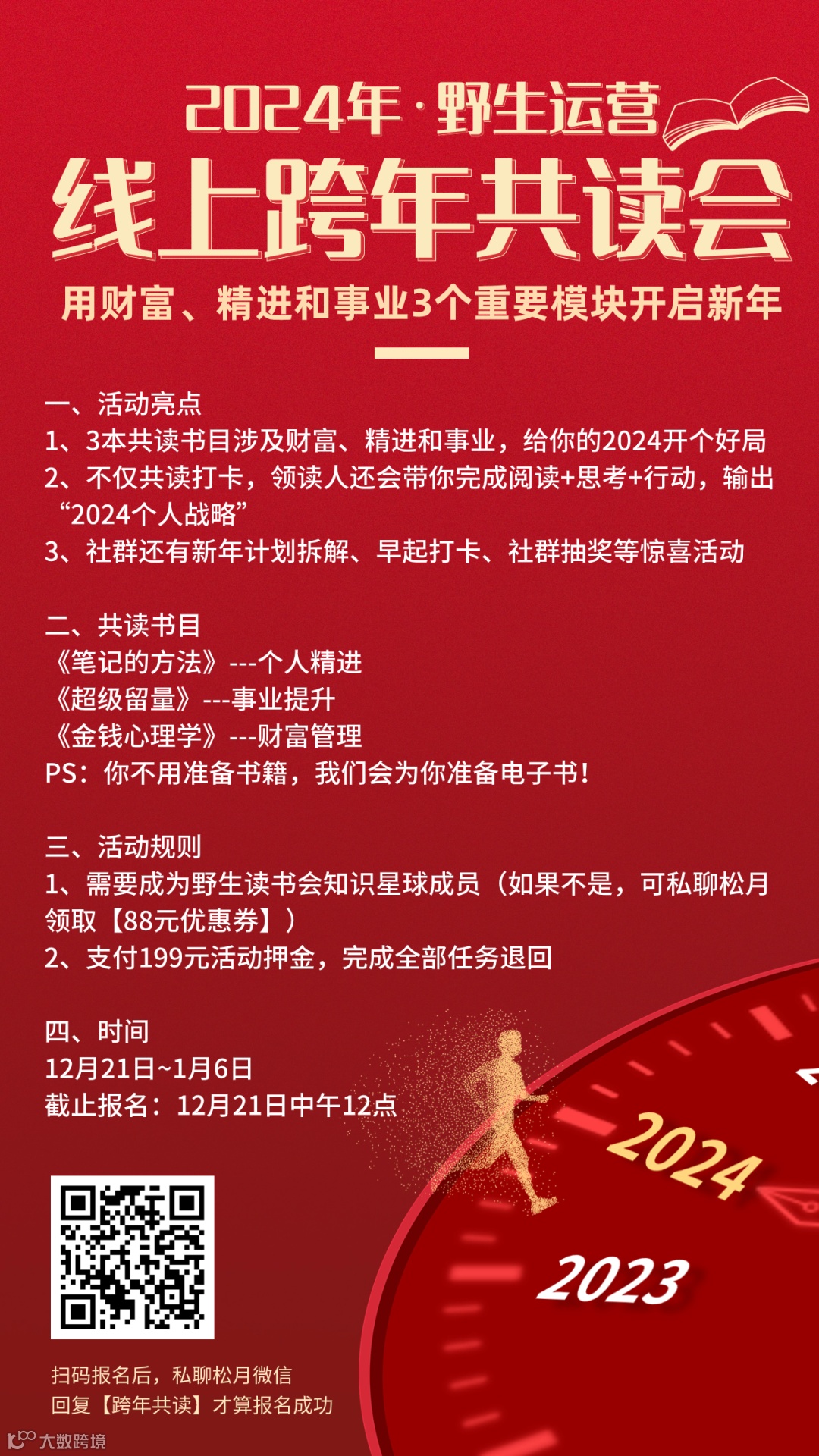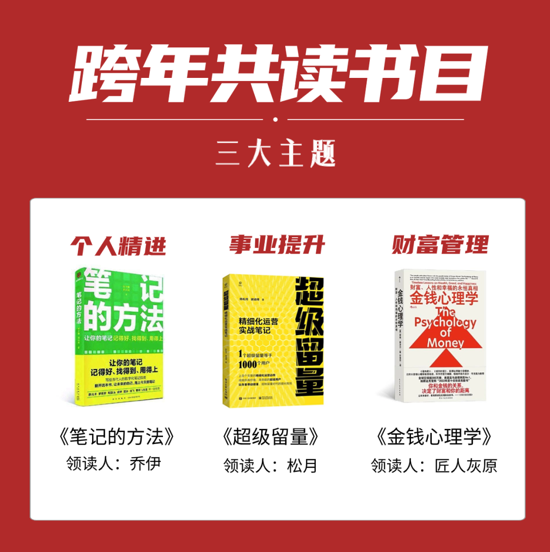 是的,12月21日~1月6日,野生运营跨年共读会来啦,我们将会连读共读《笔记的方法》、《金钱心理学》和《超级留量》,聚焦个人精进、财富管理和事业提升三个方面,如果你也对此感兴趣,请继续看下去吧!