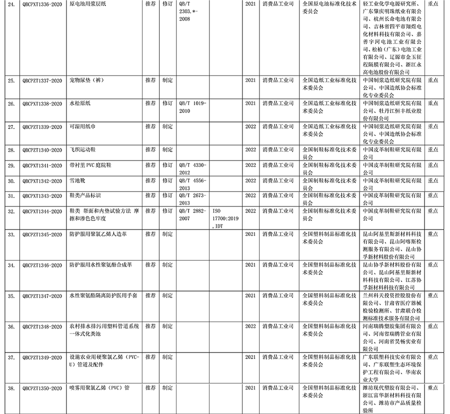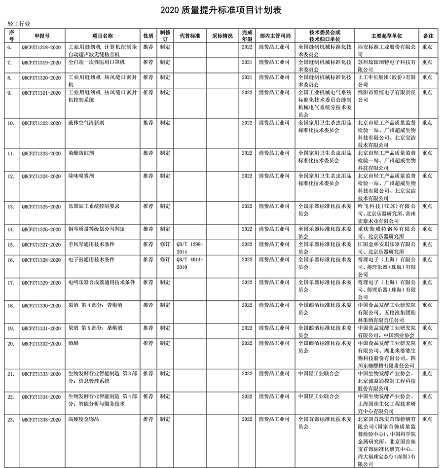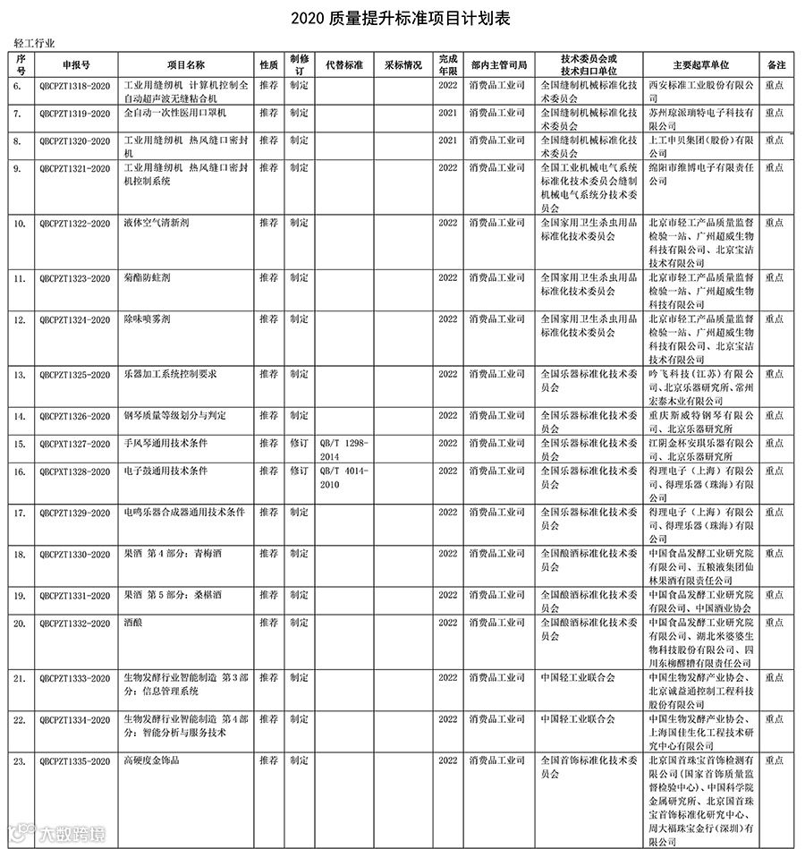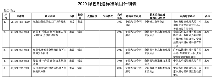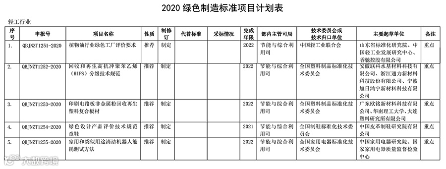 5月25日,根据标准化工作的总体安排,工业和信息化部公示了申请立项的914项行业标准计划项目,其中涉及轻工行业的有5项绿色制造标准项目计划、55项2020质量提升标准项目计划和33项其他标准项目计划。公众如对拟立项标准项目有不同意见,可在公示期间填写《标准立项反馈意见表》并反馈至工业和信息化部科技司,电子邮件发送至KJBZ@miit.gov.cn,截止日期为2020年6月24日。