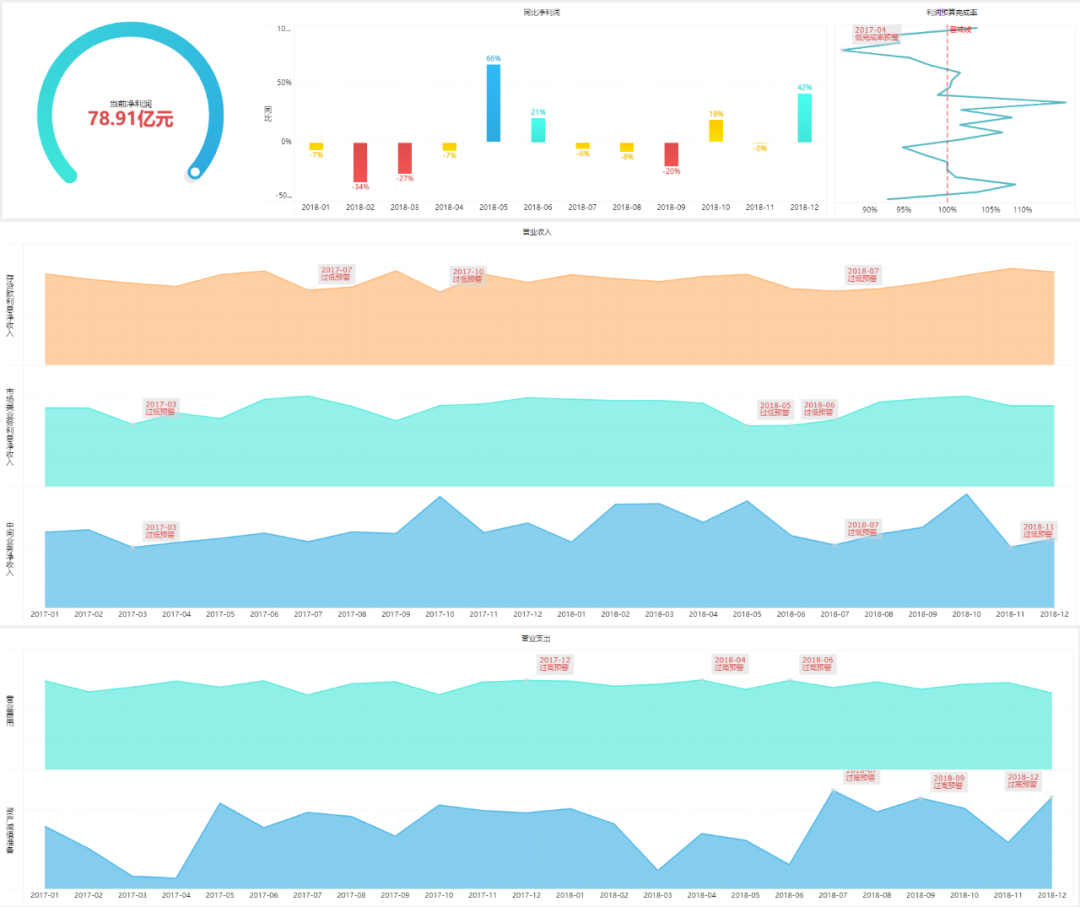 针对利润完成率设置警戒线,可以了解哪一段时间利润水平下滑,从而进一步探寻原因。 通过地图、折线图、KPI指标卡等组件,从地理等多个维度观察数据,辅助决策。
