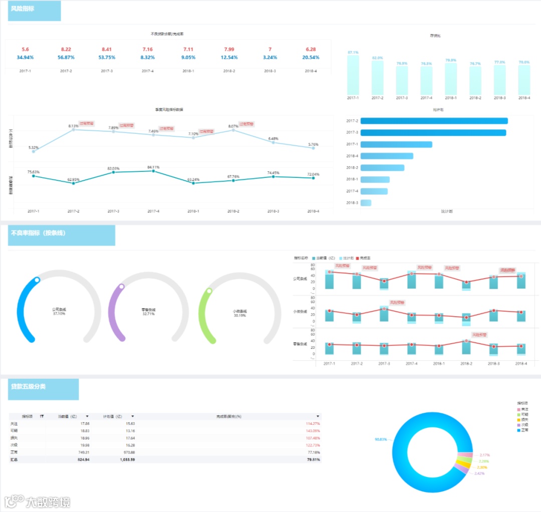 分析维度:时间、地理维度、各分行、业务条线等等 展现方式:组合图、饼图、指针图、明细表等等