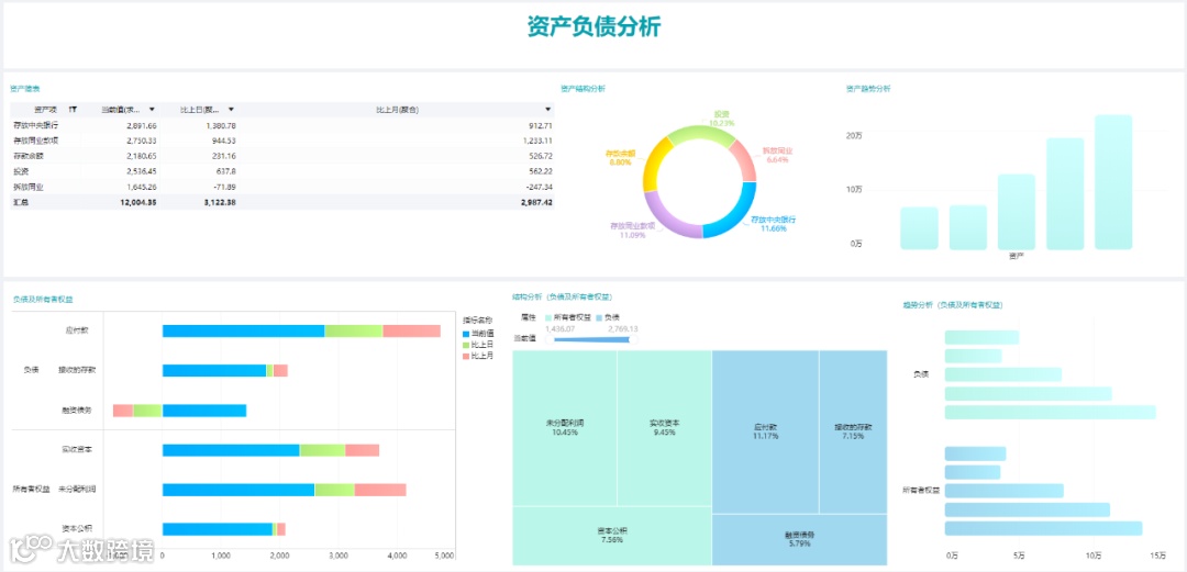 分析维度:时间、地理维度、资产项、资产结构等等 展现方式:组合图、饼图、指针图、明细表等等