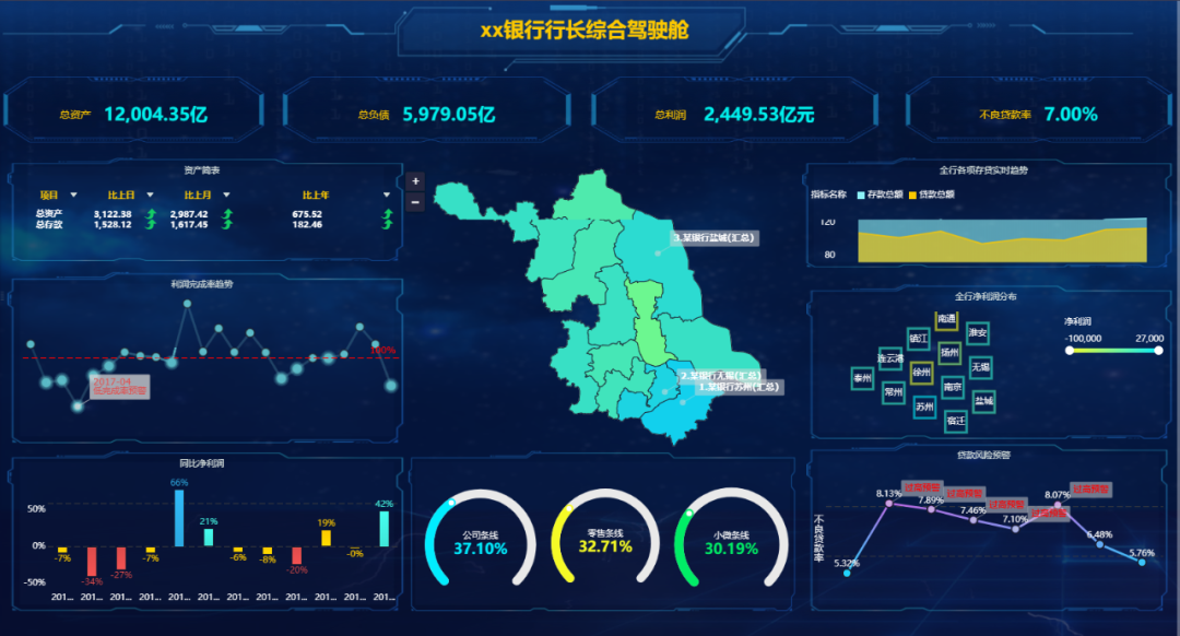 分析指标:总资产、总负债、总利润、不良贷款率、总存款、利润完成率等等 -