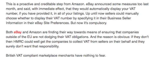 eBay和亚马逊(Amazon)都在想方设法确保欧盟以外的企业不逃避增值税义务。原因很明显:如果他们不这样做的话,HMRC很可能会让这些公司从卖家那里收取增值税,他们肯定不想承担这样的责任。