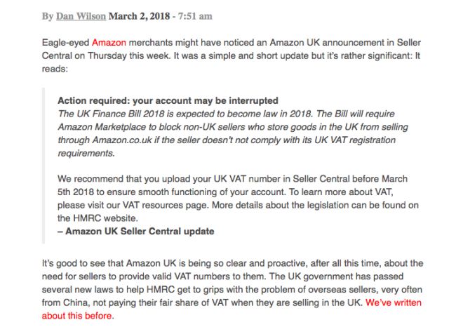 经过这么长时间,非常高兴可以看到亚马逊英国有一个比较明朗的局势了,并且他们现在对卖家积极主动提供有效的增值税税号的需求是如此的清晰与积极。英国政府已经通过了几项新法律,以帮助HMRC解决海外卖家的问题,这些卖家通常来自中国,且他们在英国进行销售时并没支付他们的增值税。