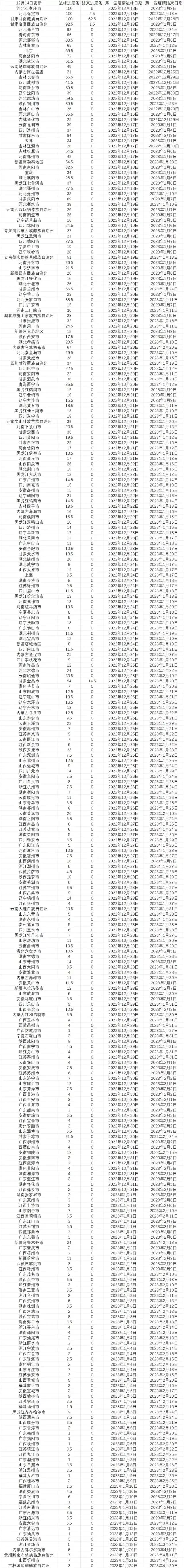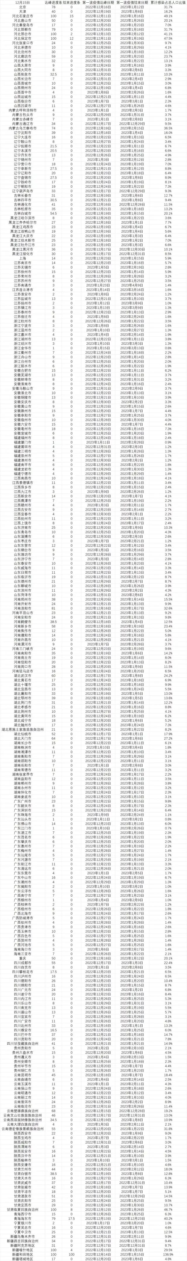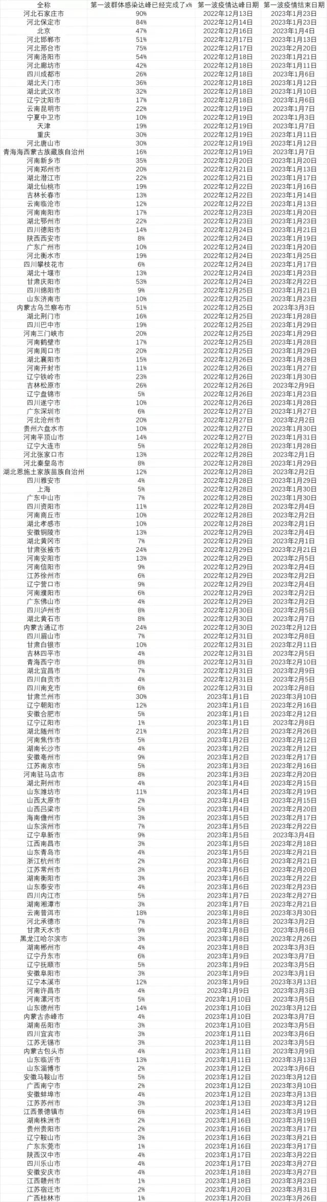 这是计算的结果,列出了所有能在明年春节前达峰的城市以及这些城市在达峰前已经感染的人口比例(截止至12月10日)。