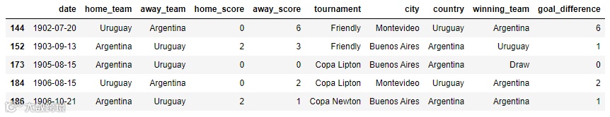 紧接着我们针对某个单独的国家,统计历史过往中所有比赛的胜负率情况,例如小编比较喜欢阿根廷队,就筛选出阿根廷队的历史战绩,代码如下